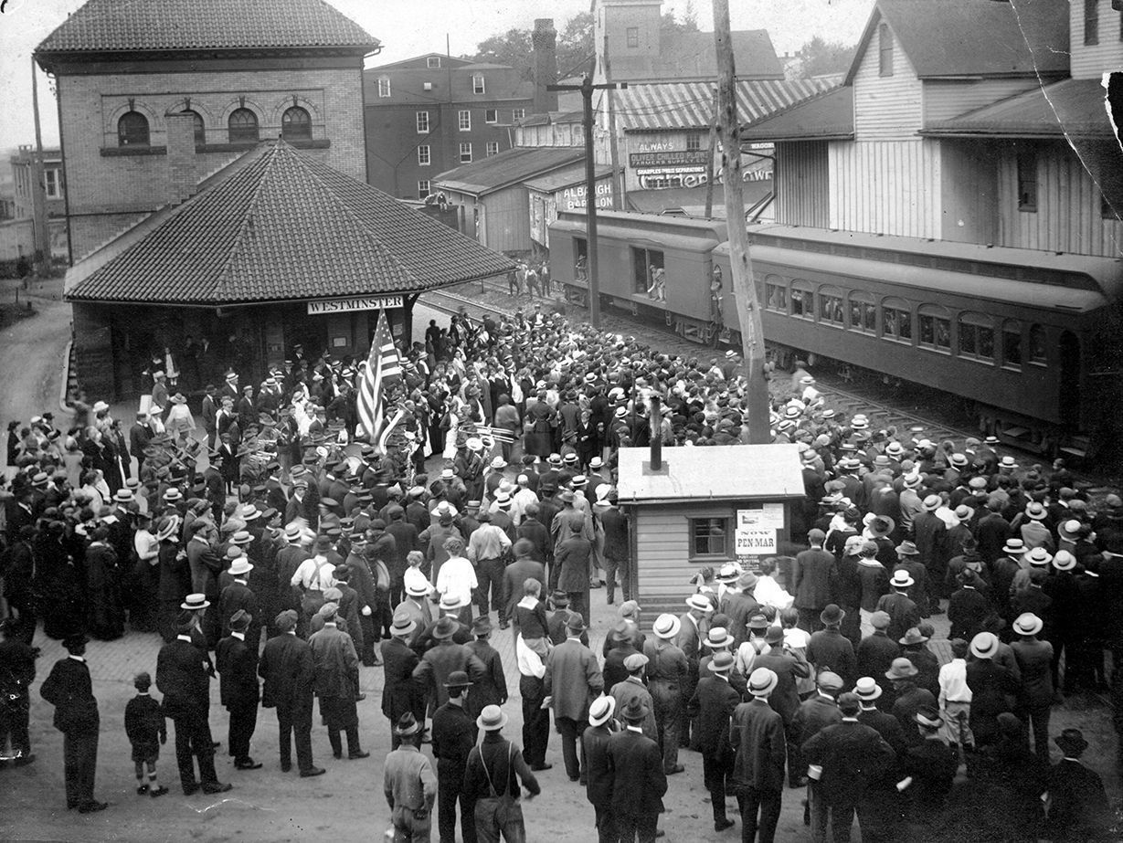 Print, photographic. Crowd gathers to see Company H. of the Maryland National Guard depart for the Mexican border from the Westminster railroad station,1916. Back reads, "Co. H 1st Regiment. Maryland Nation Guard. Oscar C. Bixler among those leaving for Mexican Border 1916. Photo by James Mitchell. Property of Harry E. Bixler." 6.25" x 8.25"Acquisition