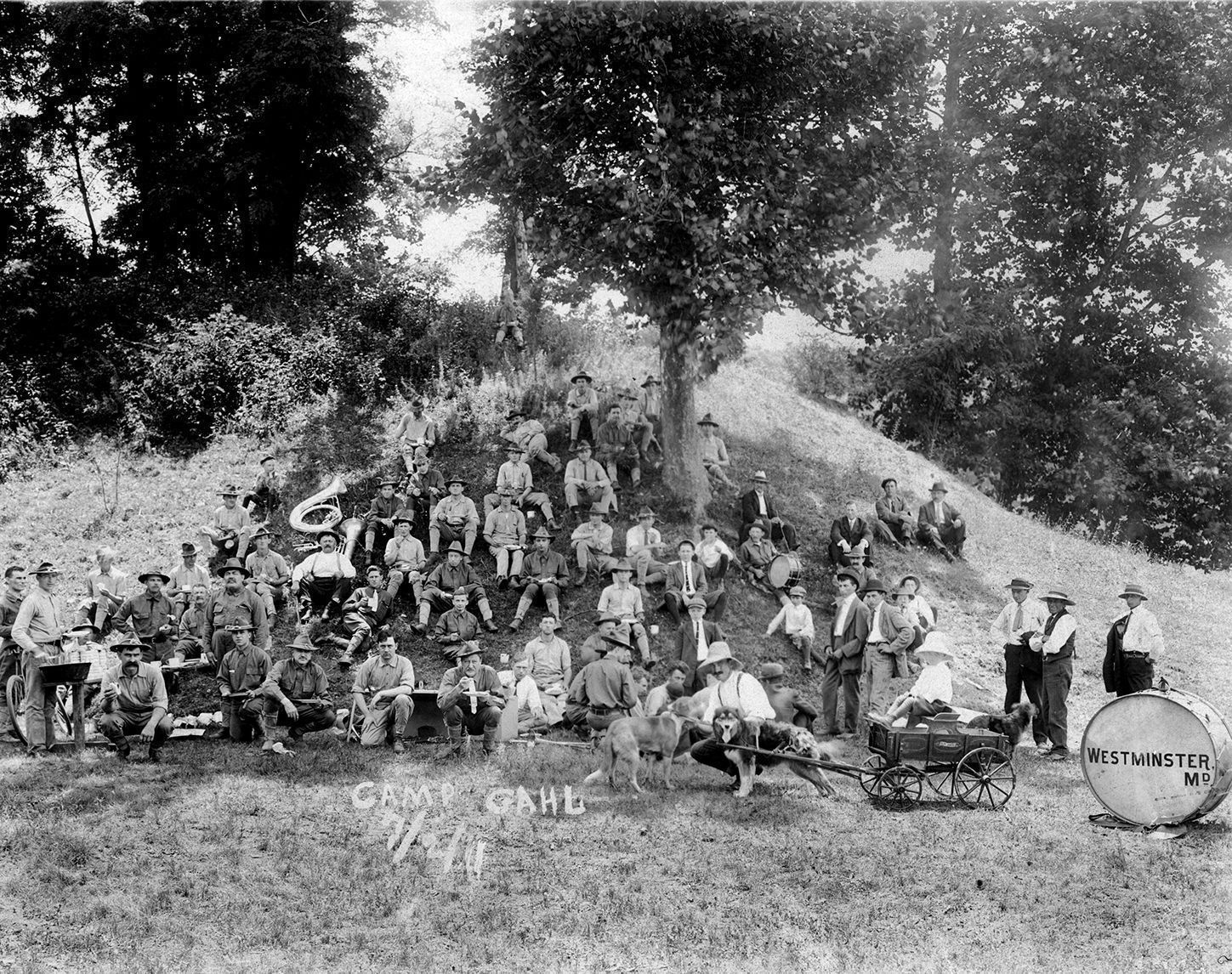 Print, photographic. B/W photo of First Regiment Maryland National Guard Band sitting on a hillside with their instruments. May have been taken at Camp Gahl; note says location may be Snowden's Woods. Mounted on black board. Front reads, "Camp Gahl 7/9/11". Back reads, "Westminster Band". 8" x 10"Acquisition
