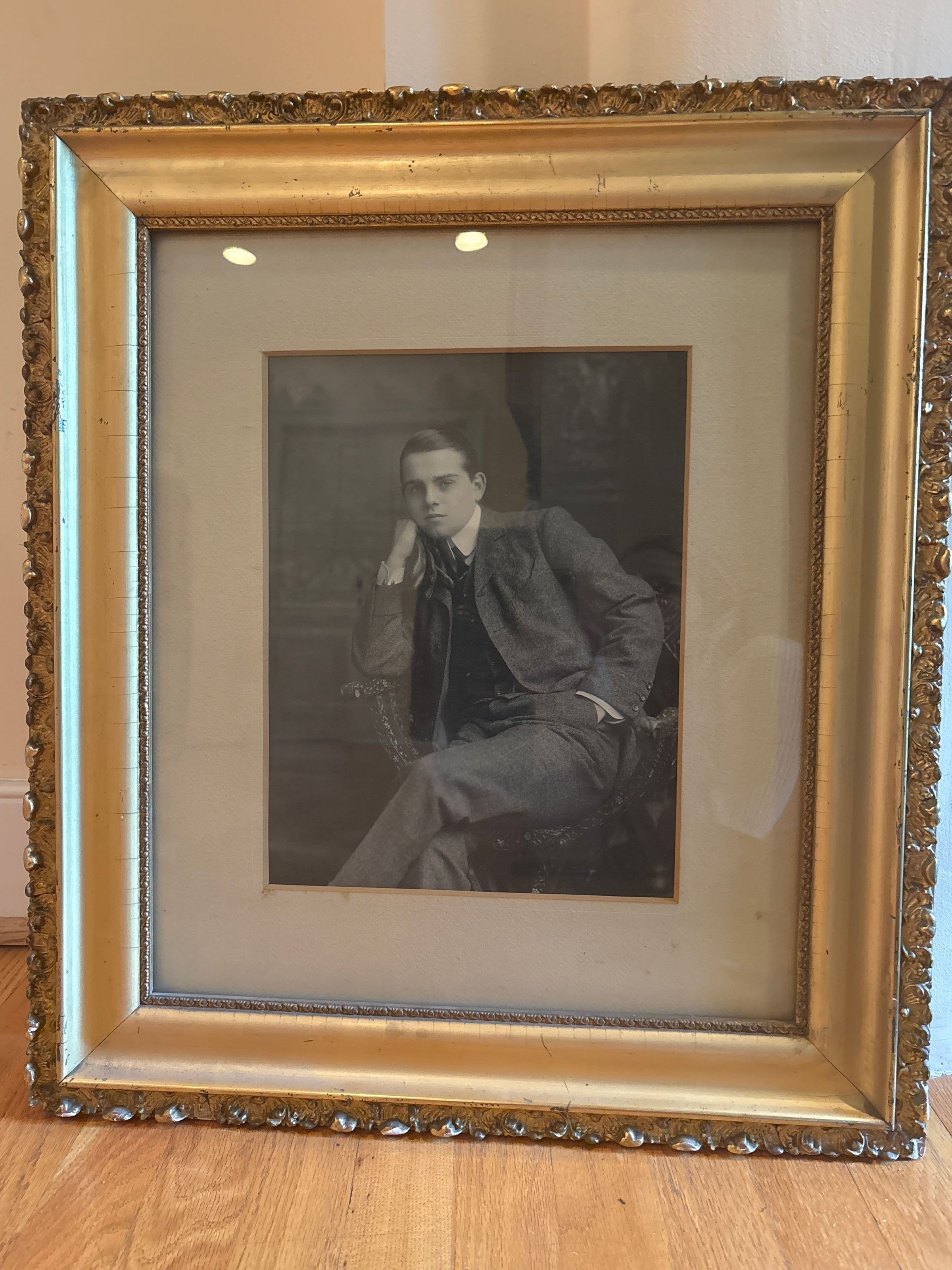 print, photographic. Black/white portrait of young man sitting, leaning elbow on arm of chair, resting chin on hand holding gloves, other hand in pocket. Handwritten label on back: "Frank Ridgely Snowden Brown Son of Gov. and Mrs. Brown. Mrs. Frank B. Beasman - donor." Sticker on back: "McCADDIN AND McELWEE, 30 WEST BALTIMORE ST., BALTIMORE, MARYLAND." Rectangular wood and gesso frame, chunky decoration, painted gold. 24.5"h x 21.5"w x 1"d.Acquisition