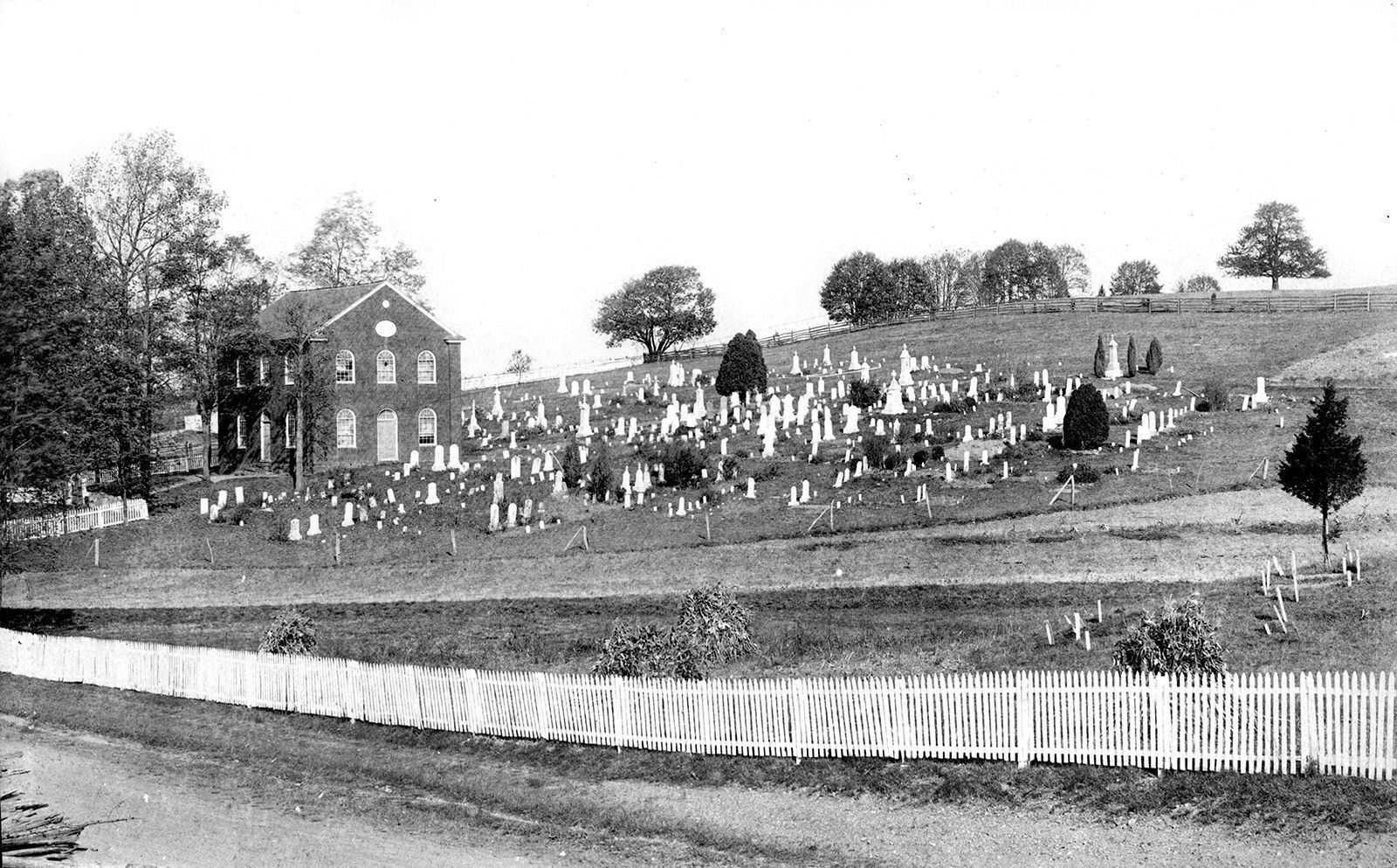 Print, photographic. Baust Lutheran Church. B/W photo of a two-story red brick church with a large fenced in graveyard in front of it. The front of the first floor has a door with a small windowed area above it in the center with a single window on either side of it. The windows and the windowed area of the door are rounded. The left side of the first floor has two more rounded top windows with a door exactly like the one on the front in between them. The front of the second floor has three rounded windows across it. There is a large white circle above the center window and a small white circular vent above that. There are three more rounded windows along the left side of the second floor. The corners of the church protrude from the rest of the building and look almost column-like. A white picket fence wraps around the front of the church and then extends outward in both directions to go around the enormous graveyard. There are headstones of many different sizes and shapes in the graveyard. There is are two evergreen bushes, one on the far right side and one on the far front end. Two other small trees are growing in there too. A dirt road runs along the other side of the picket fence closest to the photographer. The photo is mounted on a piece of black board. On front in black ink "Old Baust Church". On back in black ink "Mrs. Harry K. Myers - donor." In blue ink stamped "P.L. Weaver, Hanover". Overall size is 8" x 10"; image size is 5.5" x 9"Acquisition