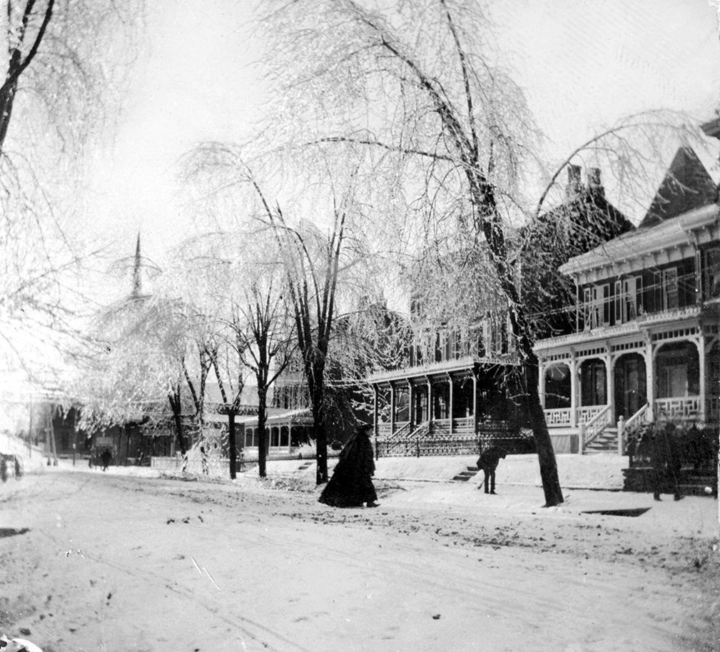 Print, photographic. B/W image showing homes along south side of West Main Street between Liberty and Bond Streets looking eastward. Steeple of St. John's Roman Catholic Church in distance. Snow/ice on ground and trees. Mounted on textured pale gray mat board. Labeled on back: "Mrs. Ober S. Herr, Sr., donor. W. Main St. Gorsuch (Cover), Woodward, Babylon homes (right to left) - 1957 - Armacost apt., Woodward apt., garage of W. H. Davis (right to left) - (Westminster)." Undated, probably c.1900. Overall size 5" x 5"; photo size 3.5" x 3.5".Acquisition