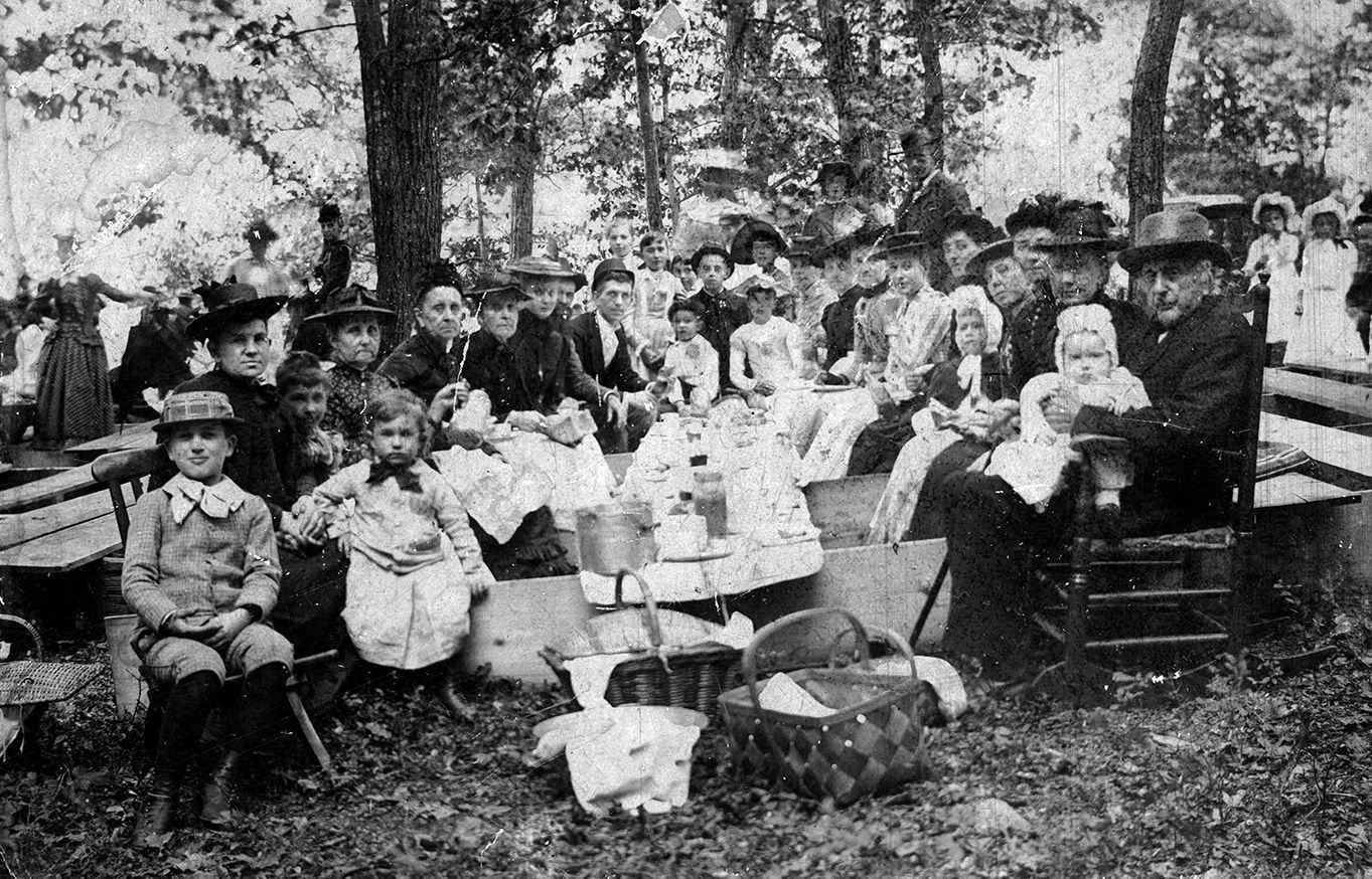 Print, photographic. B/W silver gelatin print mounted on board, 5" x 8". Image measures 4.5" x 7"; shows a large group of people - adults and children - seated around a large table put together from boards, picnic baskets visible on ground in foreground. Written on back is "looks like a M.P. picnic."Acquisition