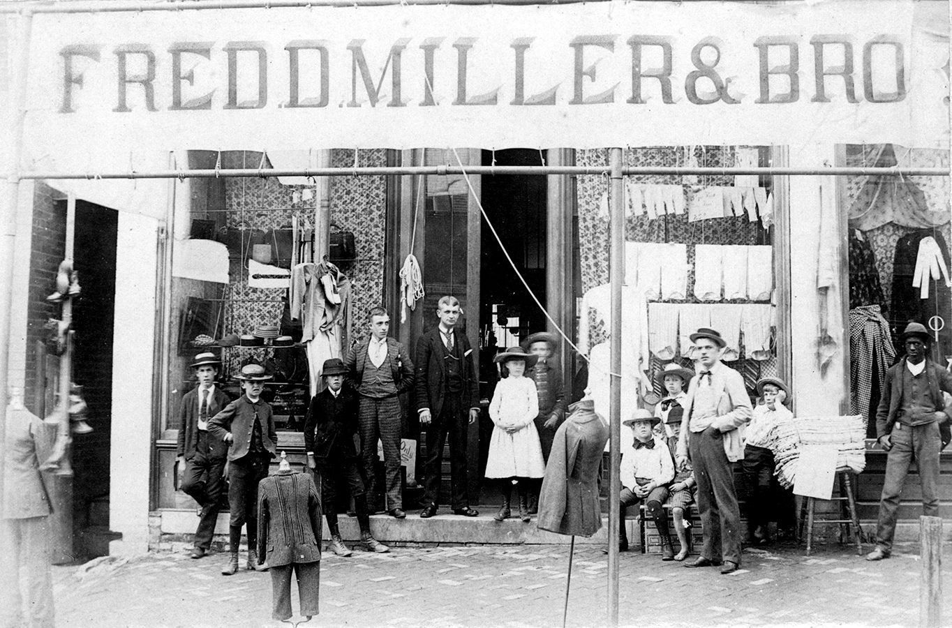 Print, photographic. B/W silver gelatin print mounted on white board, 8" x 10". Image measures 4.25" x 6.5"; shows exterior of Fred D. Miller & Bro.'s store on East Main St. in Westminster; two men in front of building. Written on back is "Located in the Albaugh bldg. Frank Miller Fred Miller."Acquisition