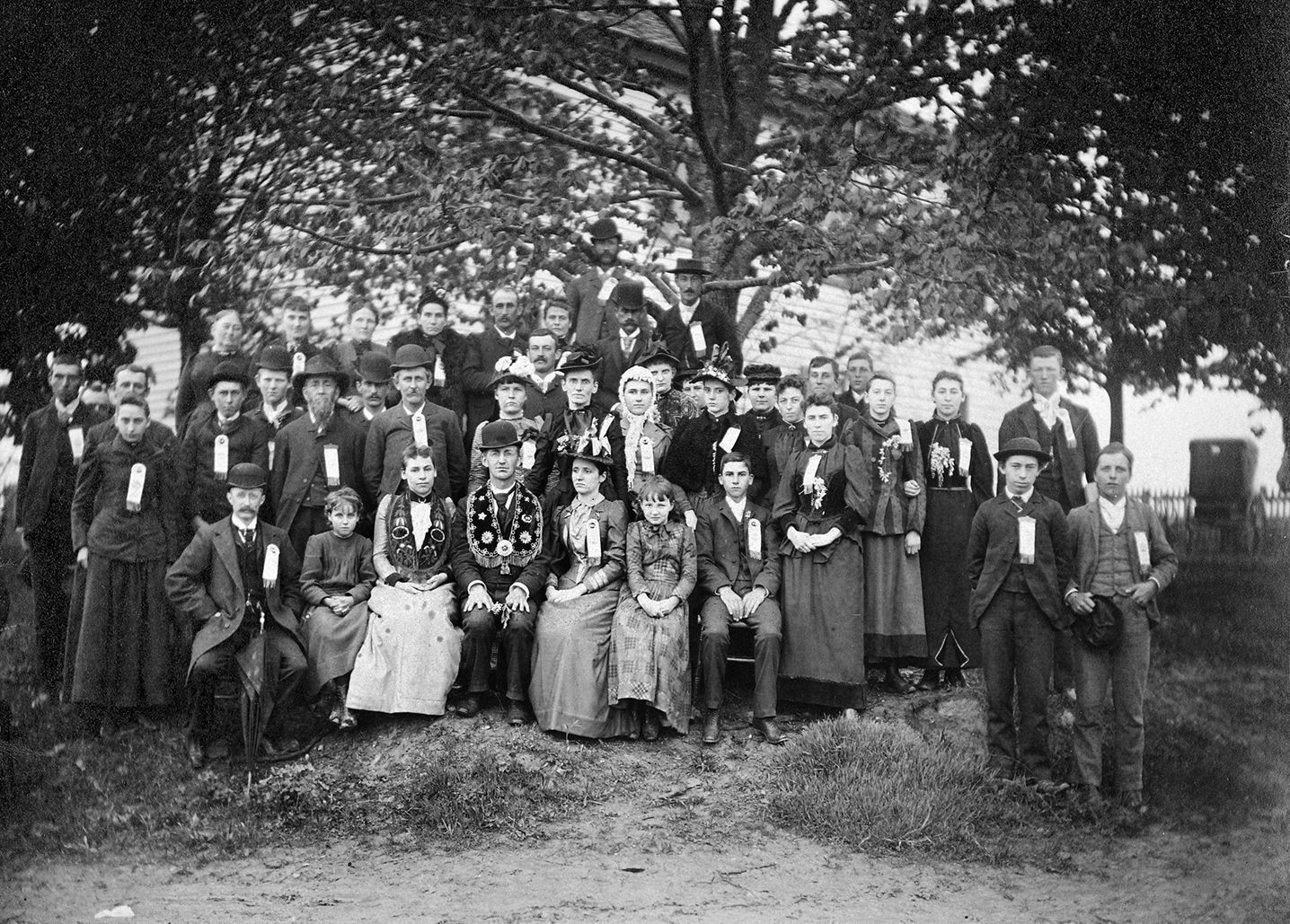 Print, photographic. B/W photograph, I.O.G.T. Lodge district meeting, in front of the Masonic Hall at Freedom, Carroll County. Shows large group of men, women and children of various ages. Man and woman at front row center are wearing regalia collars; others are wearing lodge ribbons. Mounted on cream mat board with the maker's mark in the lower proper left corner, "Marken, Photo., Frederick, MD". The inscription on the front of the mat reads,"District I.O.G.T. Lodge Meeting at Freedom - Taken in Front of Old Masonic Hall opposite New Freedom Church" as written in pen. On the back, written on a page from a Treasurer's Cash Book reads,"District I.OG.T. Lodge Meeting at Freedom, Taken in old Masonic Hall opposite New Freedom Church. Front row (seated) - Pinkney Baker, Emma Bennett, David Rice, Ida Shipley.Second Row - Vernon Ridgley, Louis Ridgley, Jim Carter, Bernard Brandenburg, Mr. Norris, Frank Lewis, Miss Luey Davis, Martha Gilliss, Ada Carter, Stella Shipley, [first name] Bennett, [first name] Ruby, Ollie De Verse. Third Row- Will Brandenburg, Mandy Buckingham, Susie Shipley, Tom Bennett, Lizzie Baker, Mr. Remells, Luella Cowaway, Leana Davis, Rob Carter. 1885-1890. Overall size 11" x 14"; image size 7.75" x 9.75".Acquisition