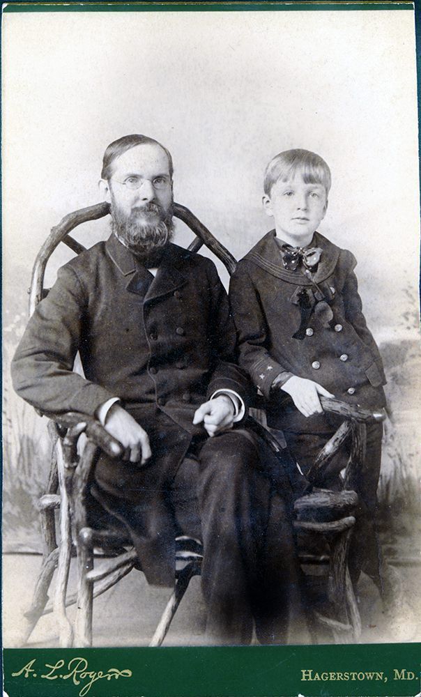 Photograph, cabinet. Images of James W. Reese and son, Paul, by photographic studio A. L. Rogers (?), Hagerstown. Undated. Reverse side labeled "J.W. Reese and son Paul." Nearly full length pose of father seated with son standing beside him, both dressed in suits. Father has mustache, full beard and glasses. Son appears to be between ages of 6 and 9 years. 6.5" x 4".Acquisition