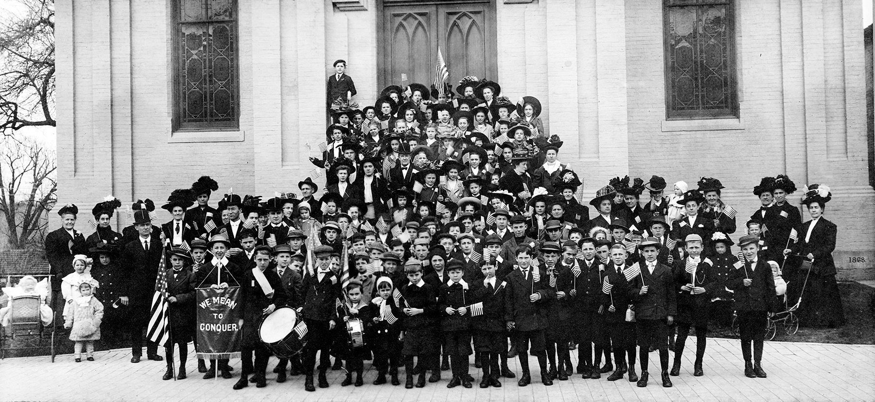 Print, photographic.B/W photo of a temperance rally outside Immanuel Methodist Protestant Church on East Main St.., Westminster. Mounted on board. Written on back: "Temperance Rally at M.P. Church, Westminster M.P. Church (New Library) Westminster." c.1915Acquisition