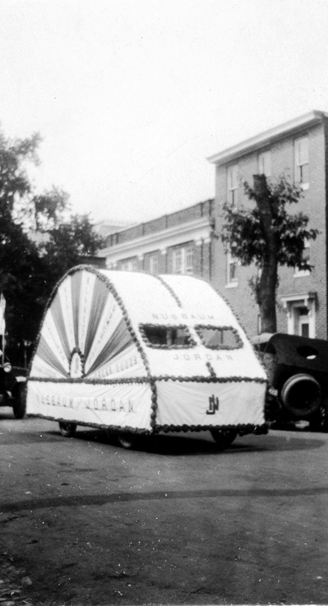 Print, photographic. B/W photo of the Nusbaum & Jordan float in a parade in Westminster. Sign on float reads "Home Goods Patterns Hosiery Blankets Cosmetics Dress Goods Nusbaum & Jordan".Acquisition
