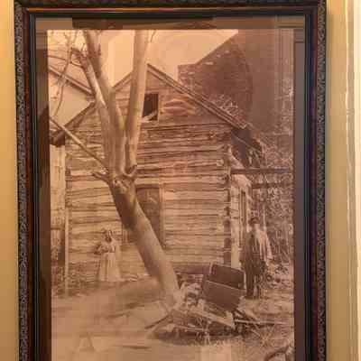 Print, photographic. B/W photograph of the log loom house in the yard behind the Shellman House. An African American couple are standing in front of the building. c. 1900Context