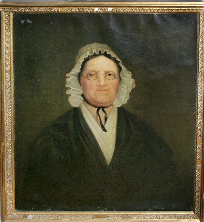 Portrait of Polly Leatherman Shriver. Oil on canvas. Frame: 32.5"h x 28"w x 1.25"d. Canvas:29.5"h x 24.5"w. Portrait, female torso, small round eyeglasses, black dress, white bonnet with ruffled edge and black ribbon tied under neck. Gilt frame, right outer edge bare wood. Written on back of frame, upper left in pencil: E. T. Reifsnider. Printed on back of canvas: Edwd. Dechaux, New York, (and) from W. A. Wisong No. 2 N. Liberty St., Baltimore.Acquisition
