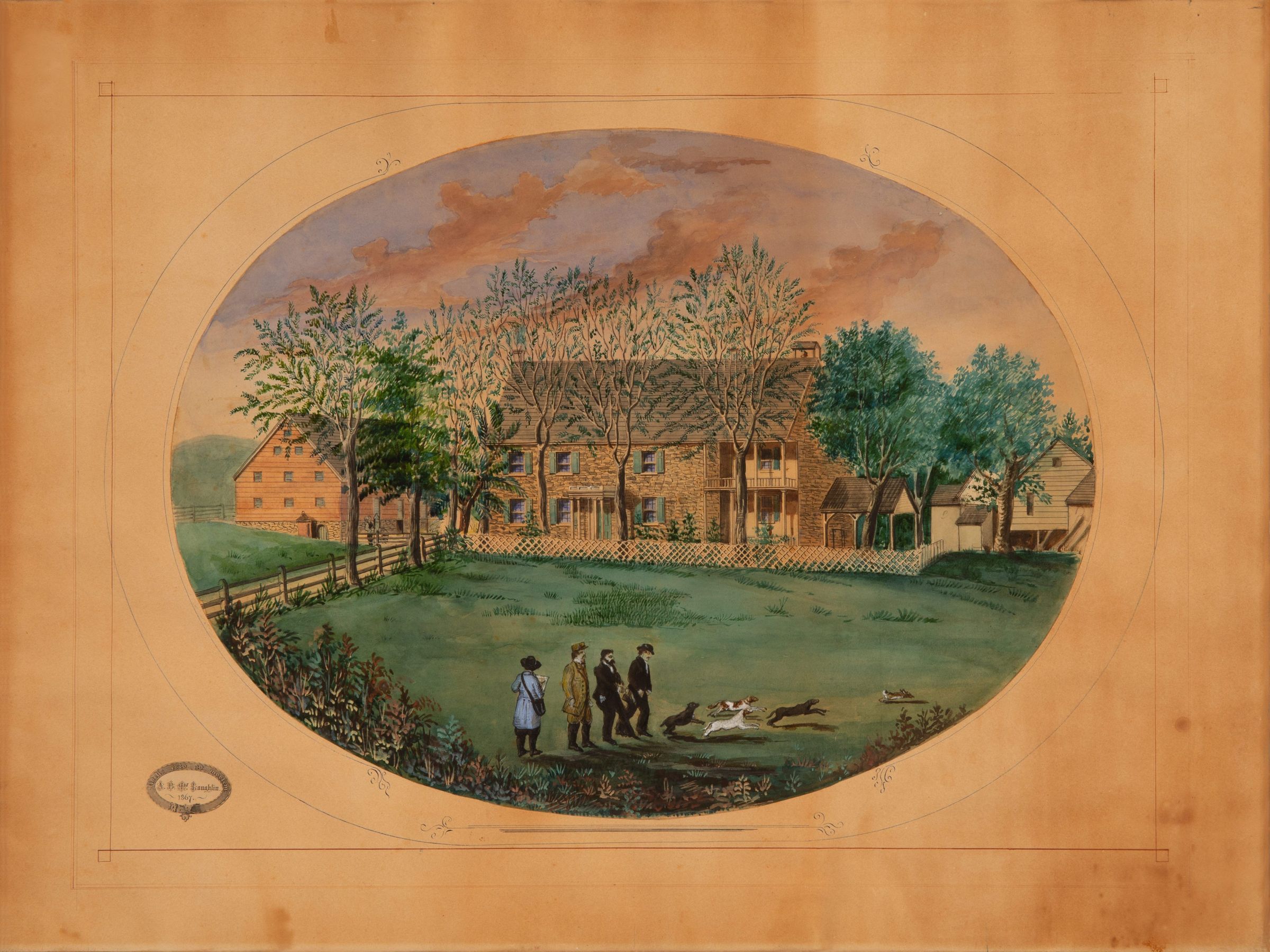 Painting. Watercolor, 1880. Show the J. Wilson Englar house near New Windsor. Image is of the house, in foreground is a man in a light blue coat who is holding a pen and sketchpad (probably a representation of the artist). The watercolor is oval on paper and is glued to a paper mount decorated with hand drawn red and blue intersecting lines. The title is on a small oval label, printed from a steel engraving, and glued to the mount. The frame is wood, made of 4 boards which overlap each other at the corners. Watercolor: 15"h x 20"w, frame: 29"h x 36"w.Acquisition