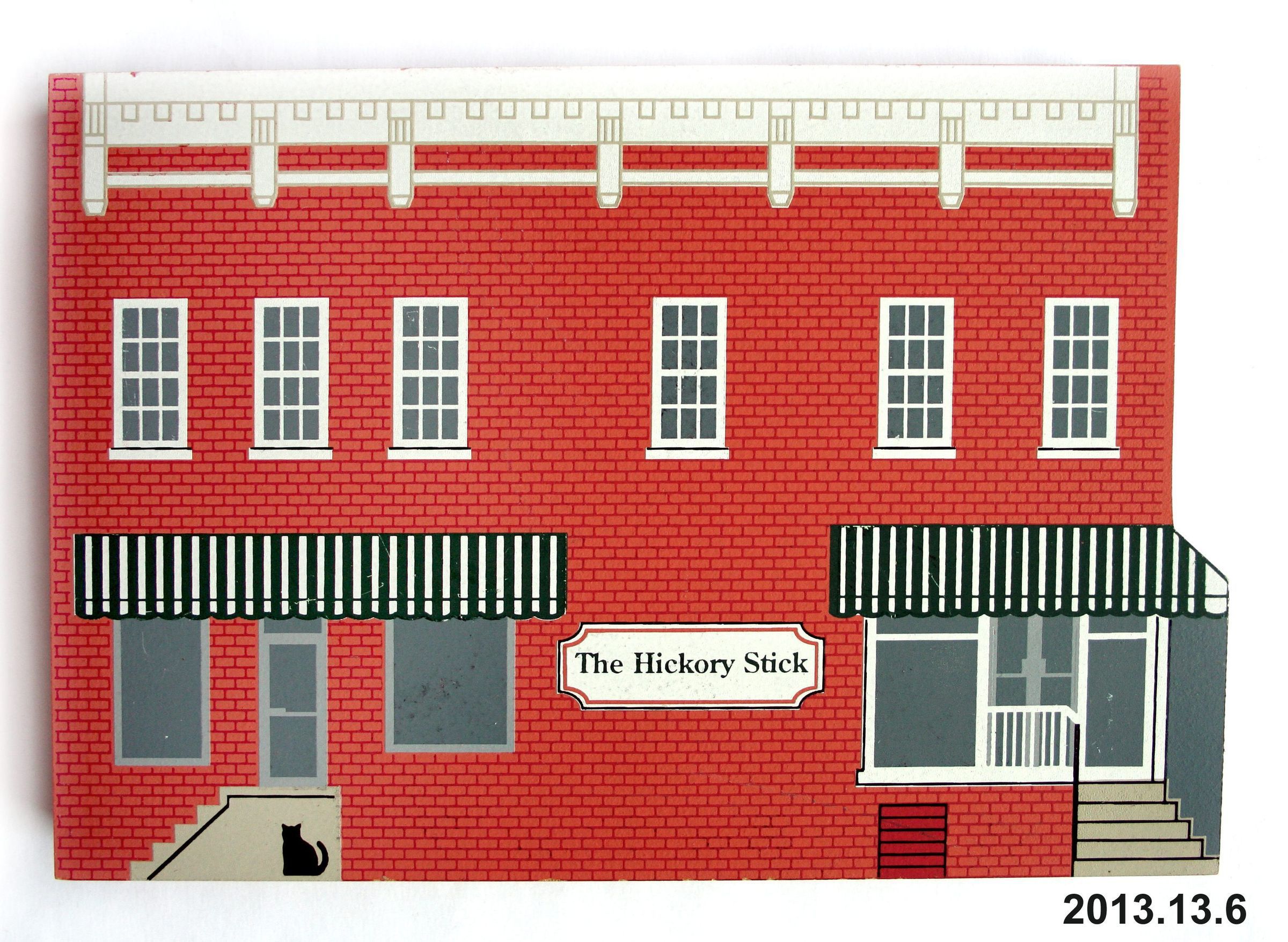 Model. The Hickory Stick, corner of Liberty and Green Streets, Westminster. Wood block, painted to resemble the building. Marked on back: The Hickory Stick (Formerly William F. Myers and Sons) 28 Liberty Street Westminster, Maryland 410-848-4370 Commissioned Exclusively For "The Hickory Stick" © 1996 THE CAT'S MEOW. Signed on back: "Faline 96". 4" x 6" x .75"Acquisition