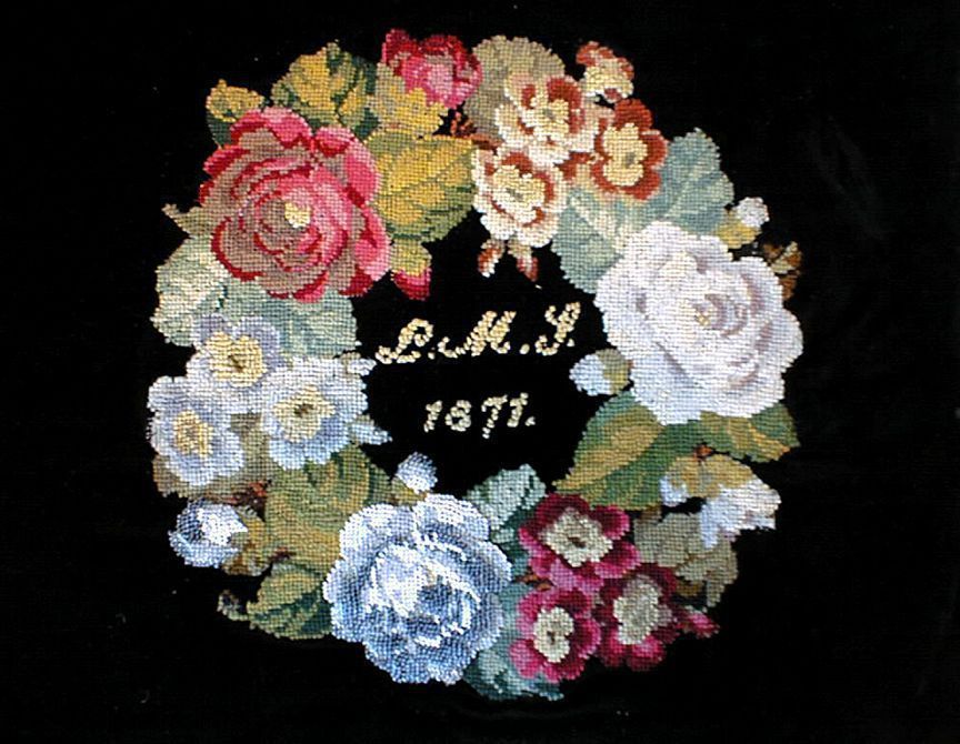 Picture, needlework. A: picture, wreath of flowers in reds and whites on dark brown velvet; flower at lower proper right worked in glass beads of white, light gray and dark gray; dark velvet ground. Marked "L.M.F 1871" at center of wreath. 16" x 18". B: frame; wood with gilding, tiered with rounded profile at outer edge; 20"h x 22"w x 1.25"d.Acquisition