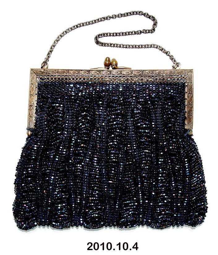 Purse. Covered with columns of swags of black beads, silk lining; brass frame at top with chain handle. 7”h x 7”, not including handle.Acquisition