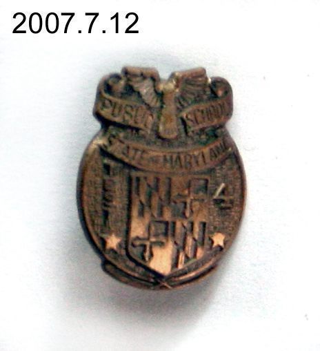 Pin, lapel. Athletic proficiency award. Bronze; shield-shaped with clasp pin on back. Embossed design: at top is a winged foot and 3 ribbons which read "PUBLIC," "SCHOOLS," "STATE OF MARYLAND." At bottom center is smaller shield with Maryland state flag; down proper right side next to flag reads "TEST"; on proper left side of flag reads "4". .75" x .625". 1930s, probably 1937.Acquisition
