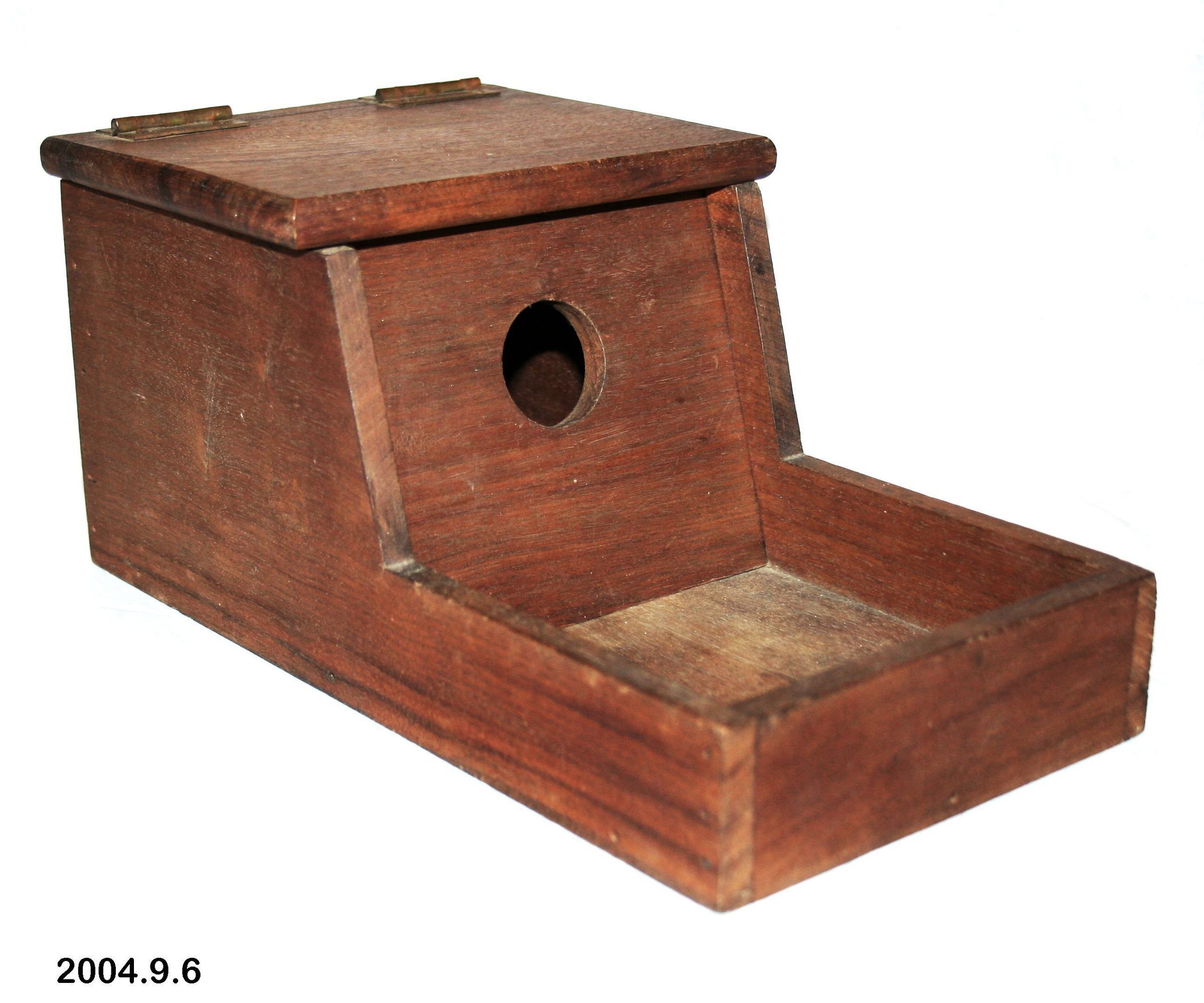 Box, ballot. Used at Improved Order of Red Men, Hiawatha Council, No. 39, Patapsco, Maryland. A: box; dark wood, possibly walnut; base is a rectangular tray with low lip; at one end the lip rises to form 3 sides of a box; hinged top on box, tray is open. 5.25" x 5.75" x 11". B: front for box; rectangular with large hole at center; slides into grooves along inside edge of box sides. C-N: marbles, black, solid color, .625" diameter. O-DD: marbles; white ceramic with incised rings around body, rings decorated with underglaze colors of red, green and blue; .75" diameter. 1930s.Acquisition