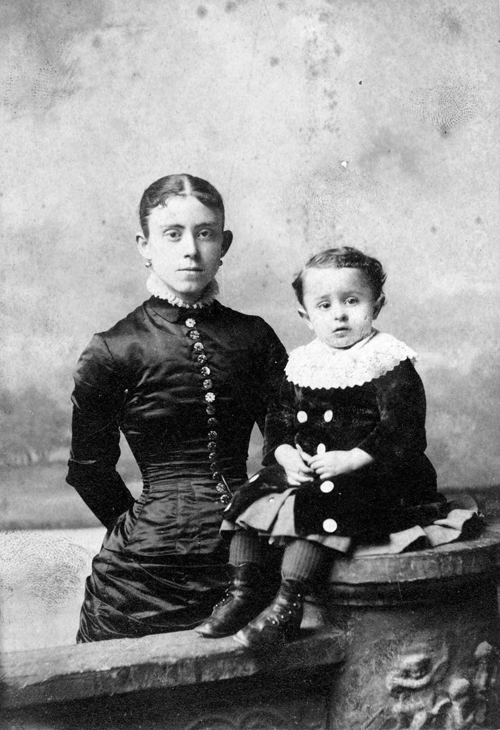 Photograph, cabinet. B/W studio portrait of Ella Troxel Albaugh and her son, Carroll. He is wearing same outfit as in 2003.13.7. Mounted on off-white board with “Baltimore Photographic Co. Baltimore” in light purple below image. Written on back in pencil “Grandmother Albaugh Carroll Albaugh.” Stamped in black on reverse “BILLINGSLEA/ALBAUGH COLLECTION GEORGE A. BILLINGSLEA.” 6.5” x 4.25”. 1883-1885.Acquisition