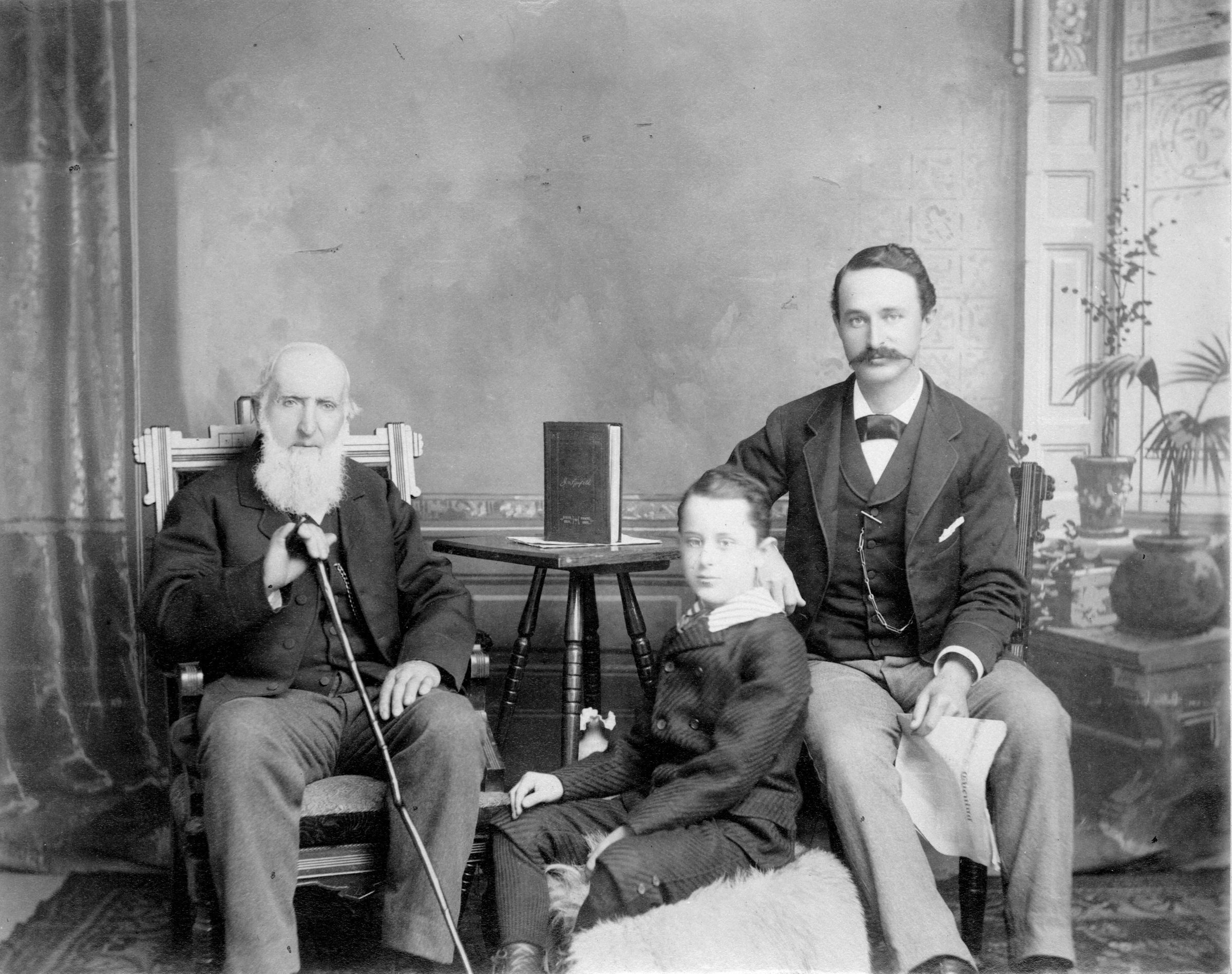 Print, photographic. A: B/W studio portrait of 3 generations of the Albaugh family. At viewing left is George Peter Albaugh [b. 7 December 1817 – d. 28 December 1891], at viewing right is his son, George Washington Albaugh [b. 22 February 1857 – d. 30 May 1933]; at center is George Washington’s son, Carroll Albaugh [b. 16 October 1880 – d. 5 December 1930]. Mounted on white board. Overall size 8.125” x 10”; image size 7.625” x 9.625”. B: Frame; wood; deep with 4 tiers; around window opening is concave gold band; above this in rounded molding, dark with incised geometric design at center of each side, design painted gold; above this is narrower gold band; outer tier is natural finish concave molding with outer edge painted black.Acquisition