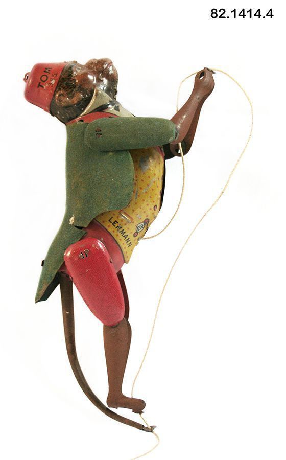 Animal, mechanical. Monkey. 8"h x 1.5"w x 3.5"d. Made of tinplate - molded on a form - two large pieces joined by tabs form head and torso; arms and legs are flat - each is made to two pieces with a single join so the limbs move; round tail curves down and tapes to end. Monkey is dressed in a red fez, yellow vest with red polka dots and trim, high-collared shirt with black tie. Monkey is wearing a blue flocked tailcoat which is made from a single molded piece of tinplate. Marked "T O M 385" on hat and LEHMANN GERMANY across bottom of vest. A string runs from the monkey's belly, up through its hands, down through its feet and out through a small hole in its tail. Pulling string causes arms and legs to move.Acquisition