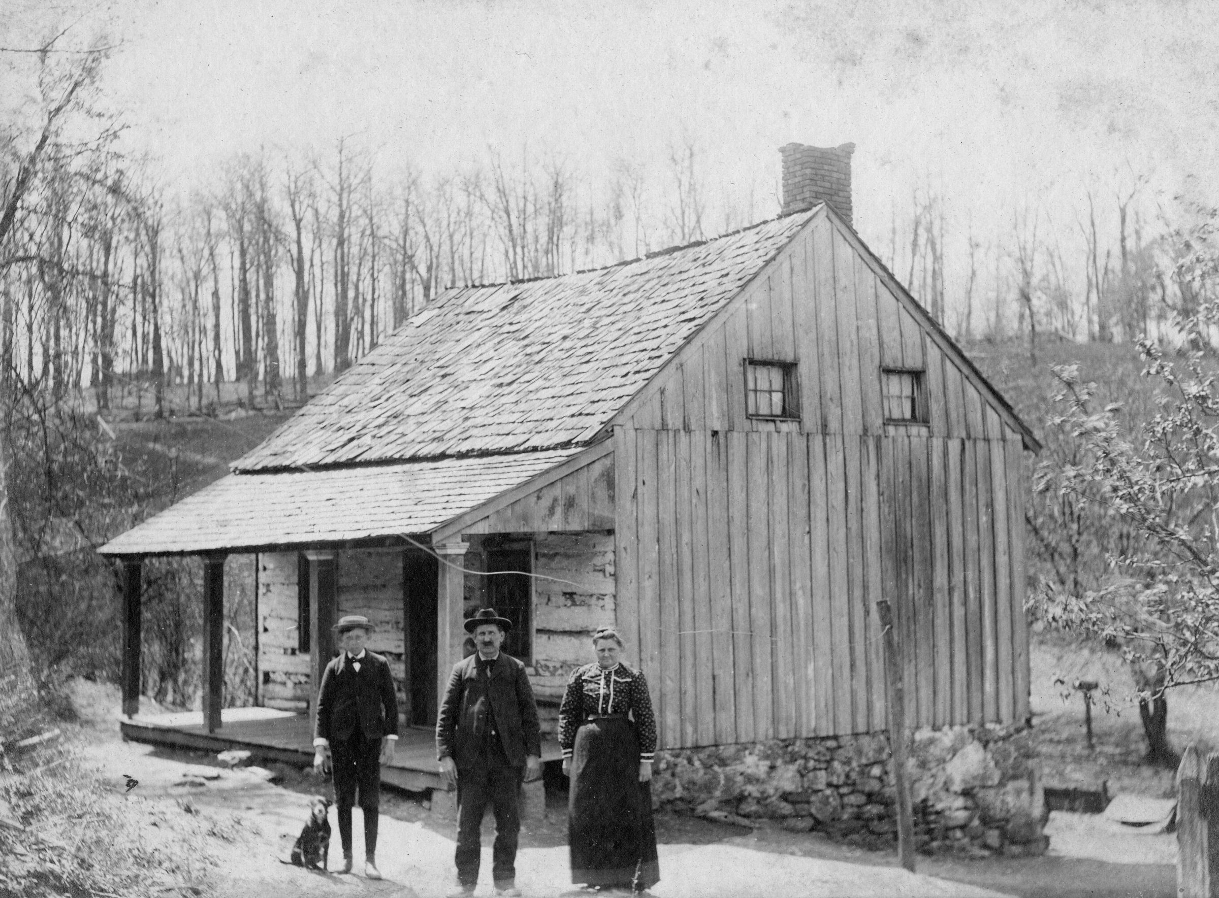 Archie, Nathaniel & Fannie Zepp at log farm houseContext