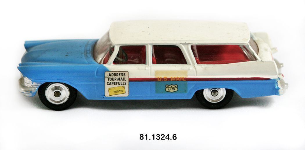 Automobile. Toy. 1"h x 1.5"w x 4.25"d. Metal car, blue and white with red interior. Stickers: "US MAIL" on back and sides, and "ADDRESS YOUR MAIL CAREFULLY" on the sides. On bottom: "MADE IN GR. BRITAIN" "CORGI TOYS" "PLYMOUTH SPORTS SUBURBAN."Acquisition