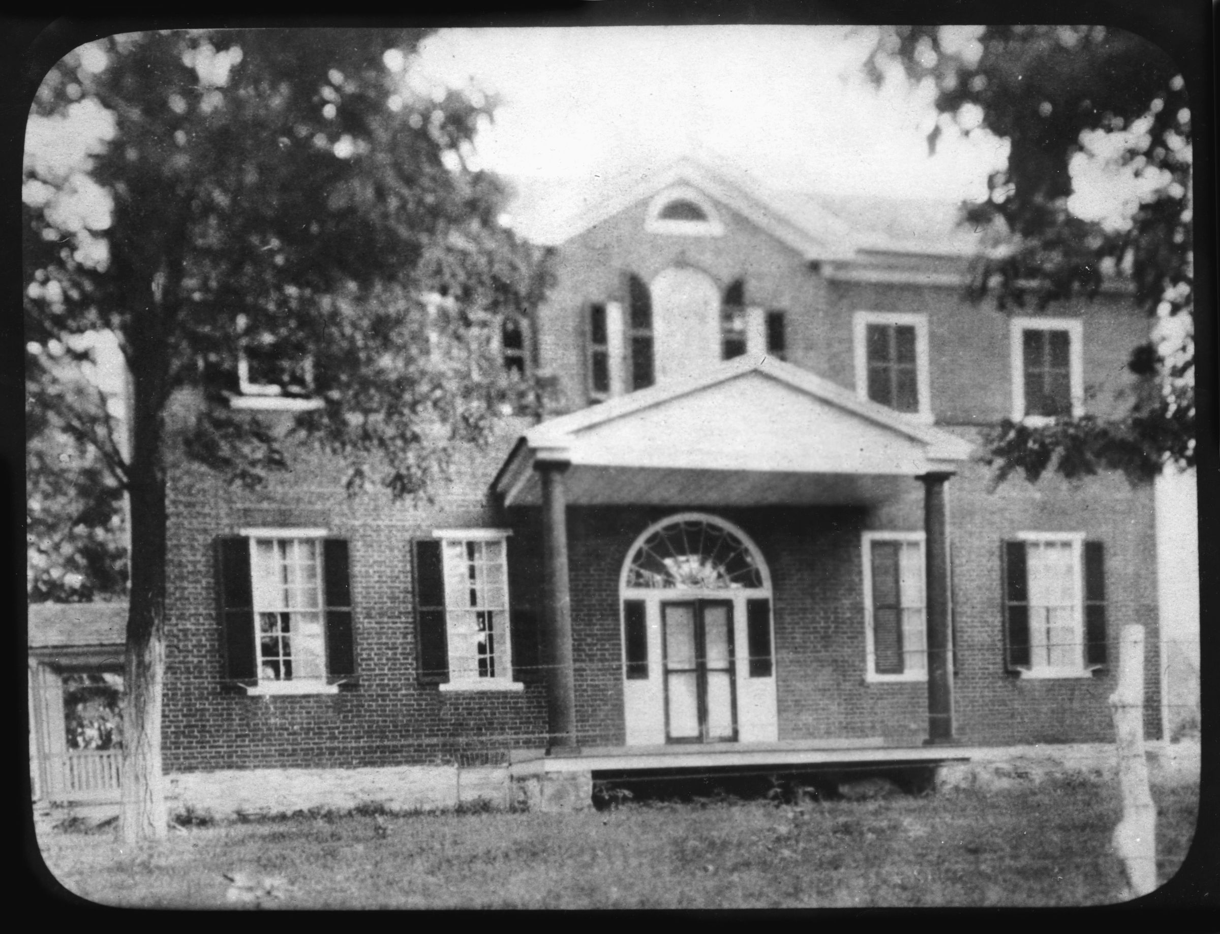 Black and white photograph of the front façade of Avondale, featuring a porch with two columns, a semi circular arch door way which is mirrored in a window above it. The photograph is not mounted or matted and the overall measurements are 8"x 10". The image size is 6.75"x 9".
