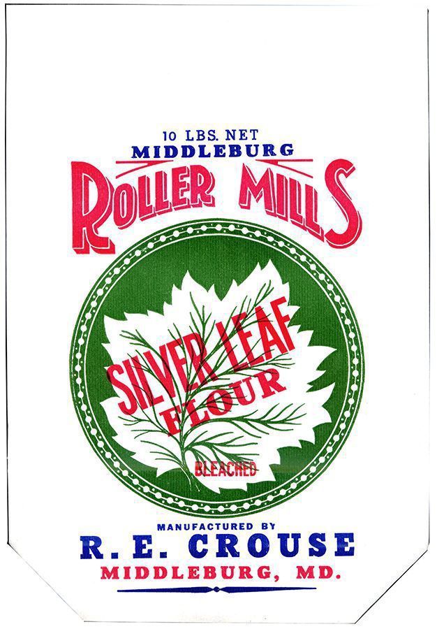 Bag. Paper, 19.12" x 9.875"; white with red and blue printing; at center is a large white leaf on a green background. "MIDDLEBURG ROLLER MILLS SILVER LEAF FLOUR MANUFACTURED BY R.E. CROUSE MIDDLEBURG, MD." 10 pounds net weight. Bag made by Grafflin, Baltimore, MD. Never used.Acquisition