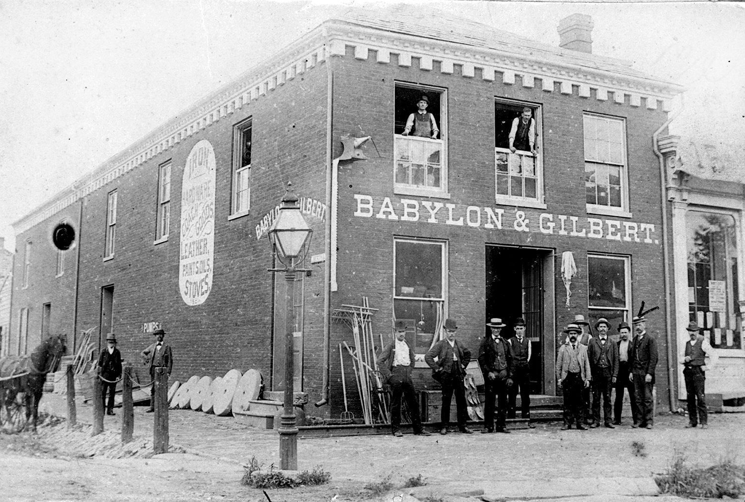 Print, photographic. B/W photo of the Babylon & Gilbert hardware store, Westminster, MD. 2-story, brick building with large dentil molding at cornice. One man stands in each of two front 2nd story windows. Two men stand at viewing left of the building. Group of 10 men stand in front of building. Oscar D. Gilbert is second from viewing right in front of building. Photographer unknown. Mounted on white board. Written on back in black ink "Oscar Gilbert grandfather of Dorothy R. Perry." Overall size 8" x 10"; image size 4.25" x 6.275". C.1900.Acquisition