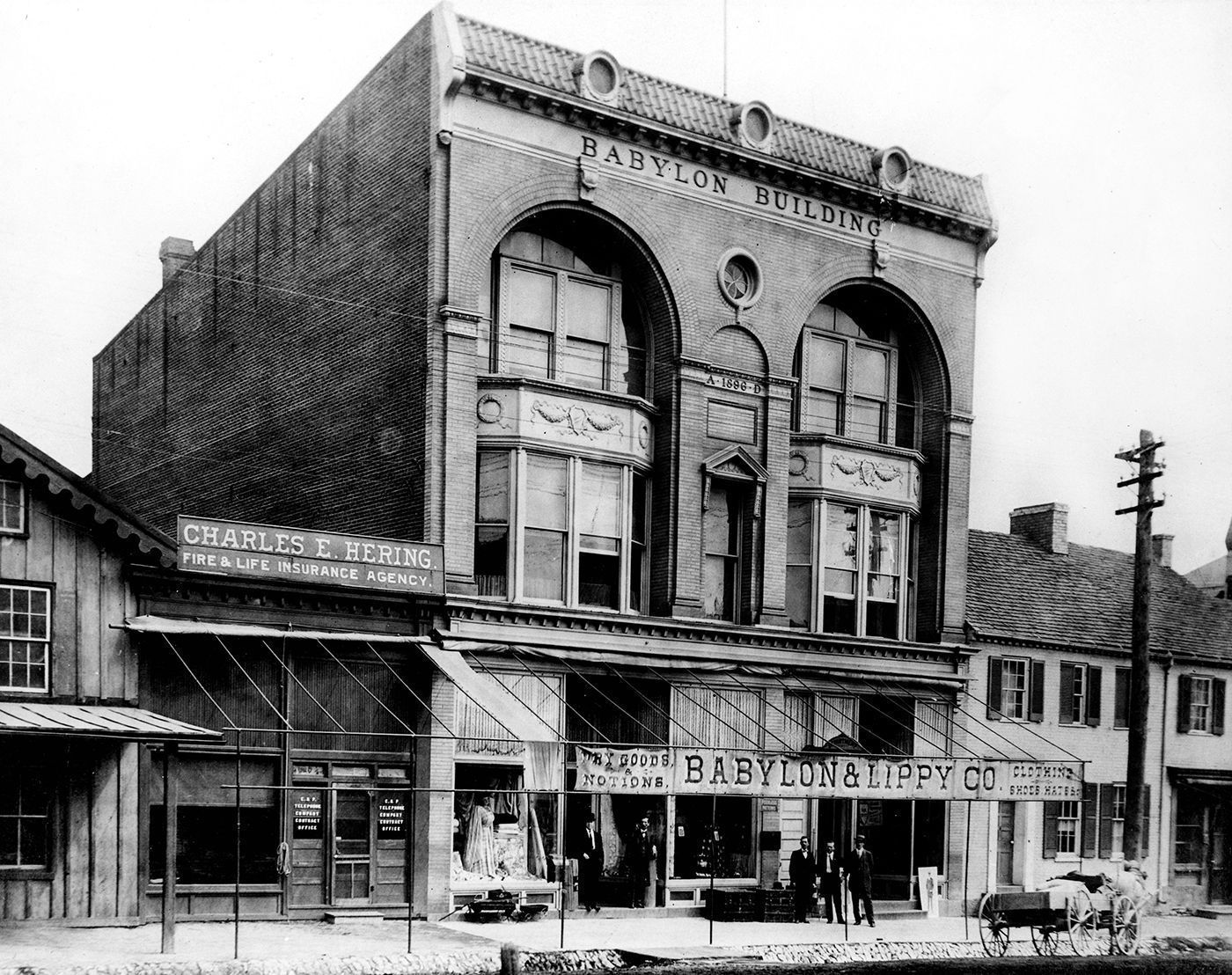 B/W photograph of the Babylon buildings, West Main Street, Westminster, late 1890s. Sign across awing in front of building reads Babylon & Lippy Co. Dry Goods & Notions Clothing Shoes Hats" Two men stand in the doorway and three others stand on the sidewalk. To the left is small frame building, Charle E. Hering Fire & Life Insurance Agency. To the right, a small building occupies the site where the Rosenstock building will be constructed. Copy print. 8" x 10"