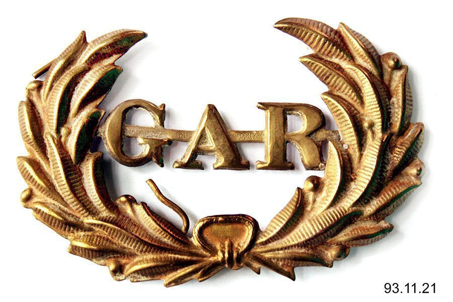 Badge. For front of hat. Grand Army of the Republic. Stamped brass "GAR" and wreath. Maker unknown, c. 1880. 1.5" x 2.5".Acquisition