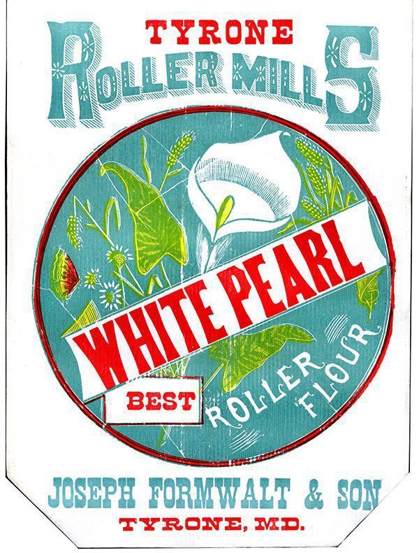 Bag. Paper, 19.25" x 11"; white with red and light blue printing; at center is large white flour with green and yellow leaves. "TYRONE ROLLER MILLS WHITE PEARL BEST ROLLER FLOUR JOSEPH FORMWALT & SON TYRONE, MD." Bag made by Lancaster Ptg. Co., Lancaster, Pa. Never used.Acquisition