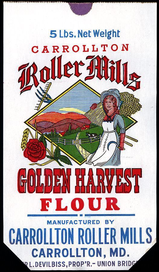 Bag. Paper, 14.75" x 8.5", white with multicolor image of a girl and a farm scene of rolling hills. "CARROLLTON ROLLER MILLS GOLDEN HARVEST FLOUR. MANUFACTURED BY CARROLLTON ROLLER MILLS CARROLLTON, MD. ABNER L. DEVILBISS, PROP’R. - UNION BRIDGE, MD." 5 pounds net weight. Never used.Acquisition