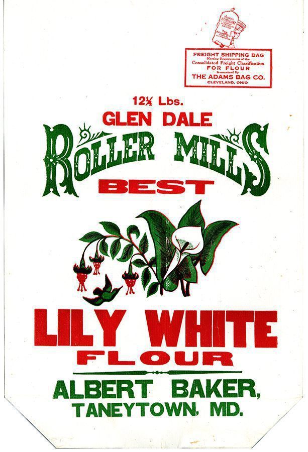 Bag. Paper, 19.375" x 11"; white with red and green printing; at center is large drawing of a white lily. "GLEN DALE ROLLER MILLS BEST LILY WHITE FLOUR ALBERT BAKER TANEYTOWN, MD." At upper right is red is "Freight Shipping Bag Meeting Requirements of the Consolidated Freight Classification For Flour Guaranteed by The Adams Bag Co. Cleveland, Ohio." Never used; insect residue on back but no signs of active infestation.Acquisition
