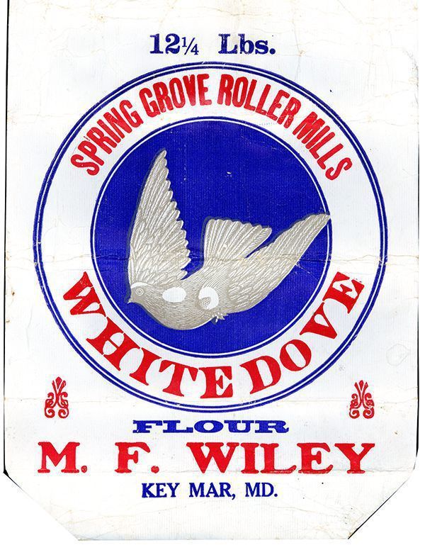 Bag. Paper, 19.75" x 11"; white with red and blue printing; at center is a large drawing of a white dove. "SPRING GROVE ROLLER MILLS WHITE DOVE FLOUR M.F. WILEY KEYMAR, MD." 12.25 pounds net weight. Bag made by The Thos. Phillips’ Co., Akron, Ohio.Acquisition