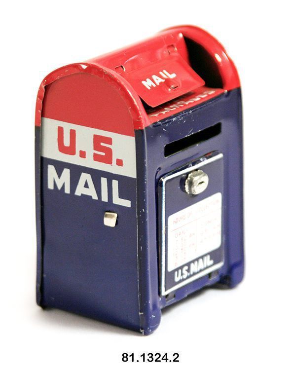 Bank, still. Toy mailbox. 2.5"h x 1.75"w x 1.375"d. Metal sidewalk style box, with flap on top and rectangular door with lock on bottom. Red/white/blue with "US MAIL" on sides. Front reads: "MAIL LETTERS AND PACKAGES HOURS OF COLLECTION." On bottom: "MADE IN JAPAN."Acquisition