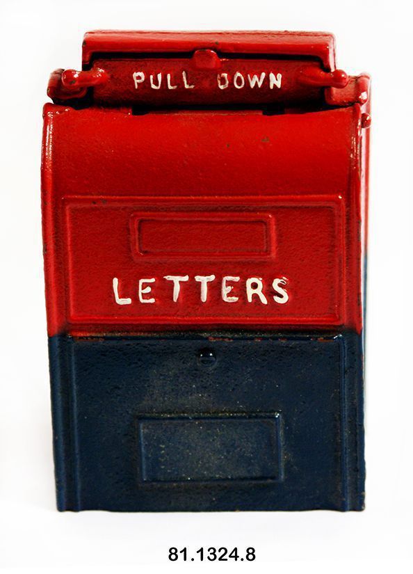 Bank, still. 4"h x 2.625"w x 1.625"d. Iron mailbox with flap for coin deposit. Painted red and blue with white lettering: "LETTERS" on front and "PULL DOWN" on flap. Screw on back to open bank.Acquisition