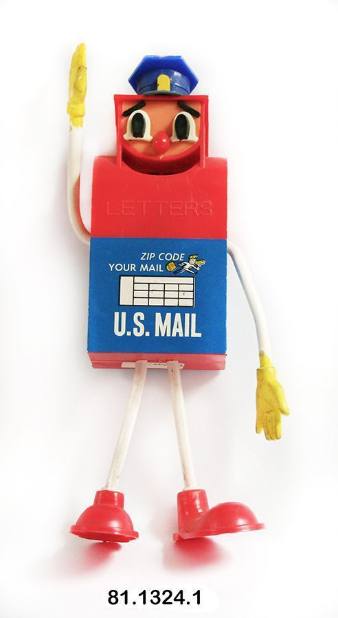 Bank, still. 8"h x 2.125"w x 1.5"d. Mailman. Body is a red plastic mailbox with bendable rubber white arms/legs. Blue hat, red shoes. Mouth is the coin slot. Sticker around body reads: "ZIP CODE YOUR MAIL US MAIL MAIL EARLY IN THE DAY I'M A BANK TOO!" On back: "© M MULTIPLE TOYMAKER N Y A DIVISION OF MINER INDUSTRIES MADE IN HONG KONG." 1967Acquisition