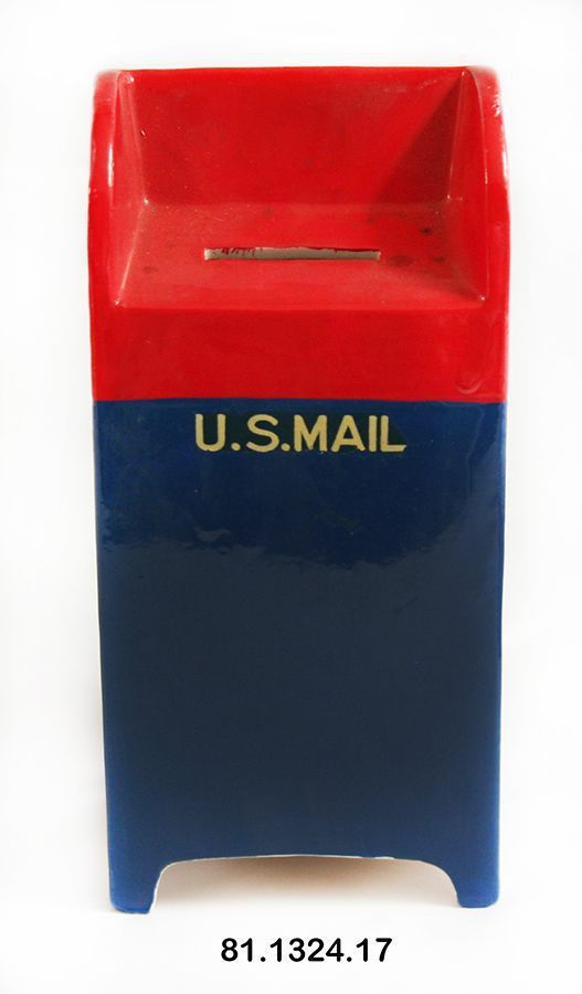 Bank, still. Mailbox. 6.75"h x 3.25"w x 2.75"d. Ceramic, red and blue with yellow lettering "US MAIL SAVE BY MAIL." Coin slot in top, rubber stopper in bottom. On bottom: "© 1962 NAPCO BEDFORD OHIO." Handwritten on bottom: "N KK."Acquisition
