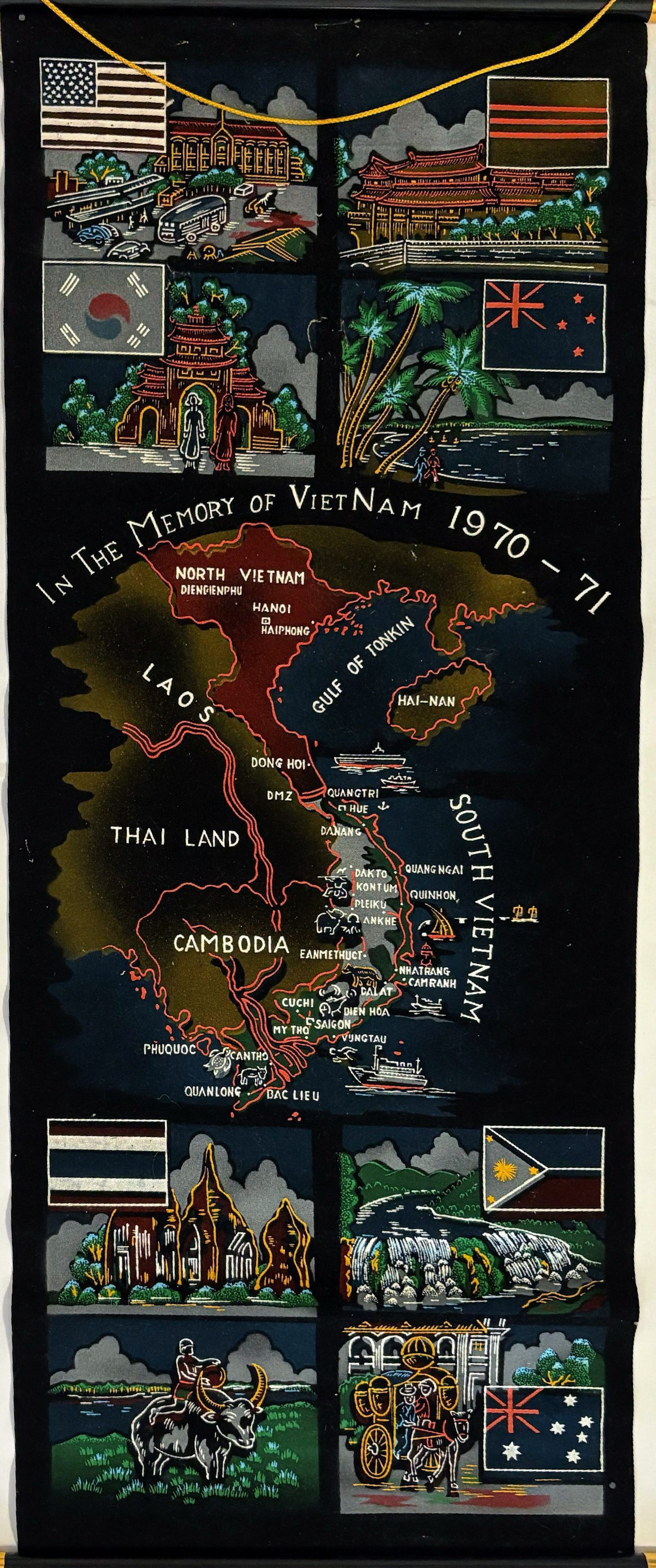 Banner, black velvet. Attached to black plastic dowels on both ends with gold tassel attached at the top. "COMMEMORATING THE MEMORY OF VIETNAM 1970-1971". The center of the banner depicts a map of the coastline of central Asia encompassing North and South Vietnam, Cambodia, Laos, Thailand and the Gulf of Tonkin with white lettering mapping certain cities and red borders. On the top and bottom of the map are scenes from Vietnam accompanied by flags of countries that participated in the conflict.Context