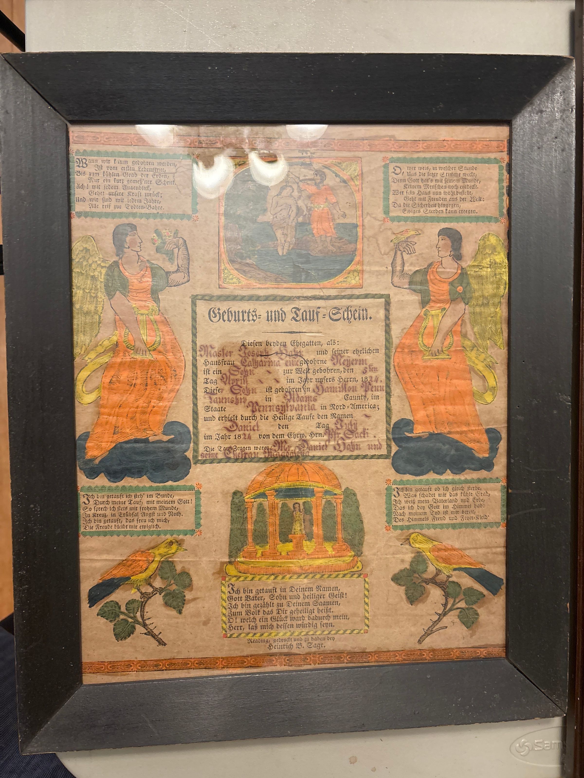 17.5"h x 14.25"w. Rectangular wood frame, plain black. Printed certificate with image of John baptizing Jesus, two angels, birds in branches. Handpainted orange/blue/yellow/green. Written in German, title "Geburts= und Tauf =Schein." Paraphrased wording: A son Daniel, born on April 15, 1824, to Master Joseph Hahn and Catharina in Hamilton Penn Township in Adams County Pennsylvania. Handwritten on back "Joseph Hahn certificate - 1825 Miss Estie Bosley donor. Hahn was a postmaster at Finksburg."