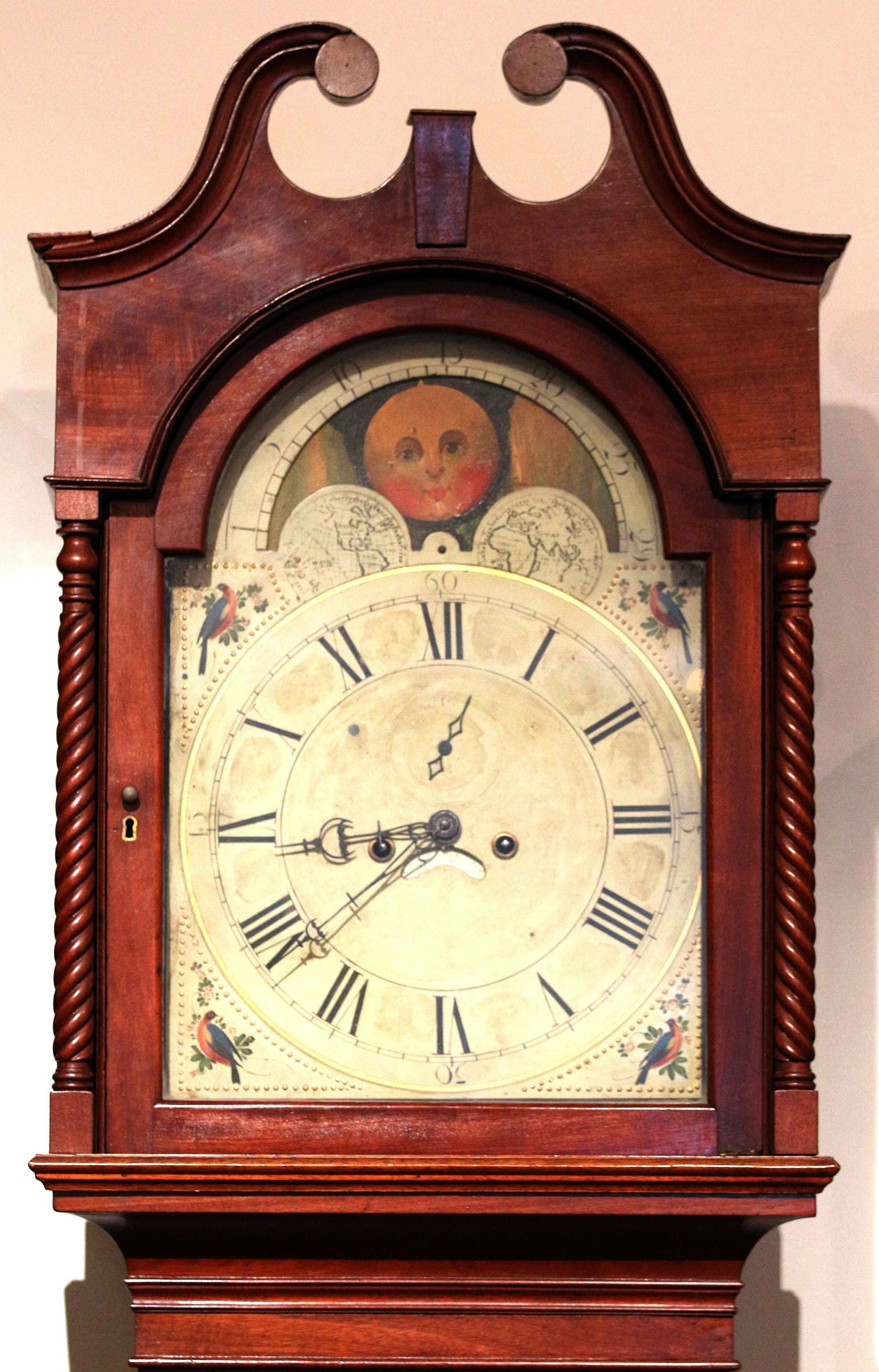 Clock, tall case. Clock measures 95.5" x 20.5" x 12.25". Clock appears to be entirely of cherry. The base of the clock has a paneled veneer front. The front corners are ornamented with spiral turned spindles, approximately 1.5" in diameter. The waist of the clock has a long rectangular door with chamfered corners at the top. This door is edged with a molding and the center is a panel of veneer. The front corners have two spiral turned spindles, with the top spindle being slightly longer than the one below it. Above the waist, there are two thin moldings before the body flares out into the bonnet. The bonnet has spiral turned spindles at the front corners and smooth turned spindles with a few decorative turned rings at the ends at the back corners. The top of the clock is ornamented with a broken swans neck pediment with a central plinth. No finials are present and there are no holes on the top of the bonnet where they would have been inserted. The front of the bonnet is veneered in cherry. Diamond shape side windows give a view of the works. A front window door reveals the painted iron face of the clock. The dial has pierced steel (with shapes of crescent moons) minute and hour hands and is marked with Roman numerals. A smaller dial in the center has a diamond shape pierced steel second hand. A recessed dial under the main dial shows the day of the month. The corners of the clock face are painted with birds on foliage, painted in blue, pink, green, and other colors. These paintings are surrounded by ornamental gilt dots. A moon dial is present at the semicircular top of the clock face. The back of the clock is composed by horizontal boards. The clock feet are bracket feet with decorative carving up to the base of the clock. The pendulum is poured lead with a brass front. Two poured lead weights are present, as is the winding key. Unknown maker. c. 1810 A: body with works. B: hood. C: pendulum. D,E: weights. F: case key. G: winding key.Acquisition