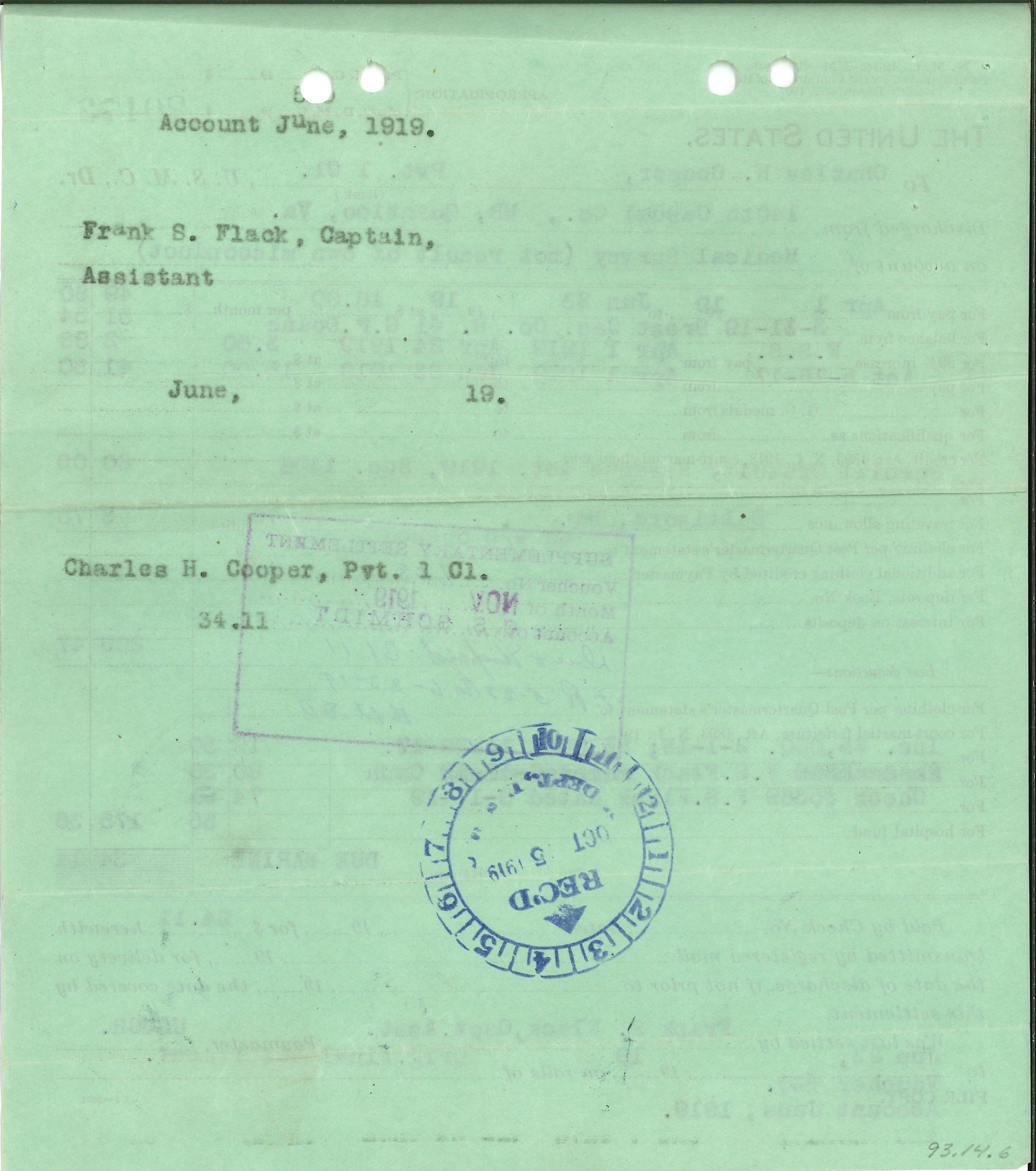 Pay receipt, Pfc Charles H. Cooper, discharged from 140 Casualty Co. MB Quantico, Va. May, 1919.Acquisition