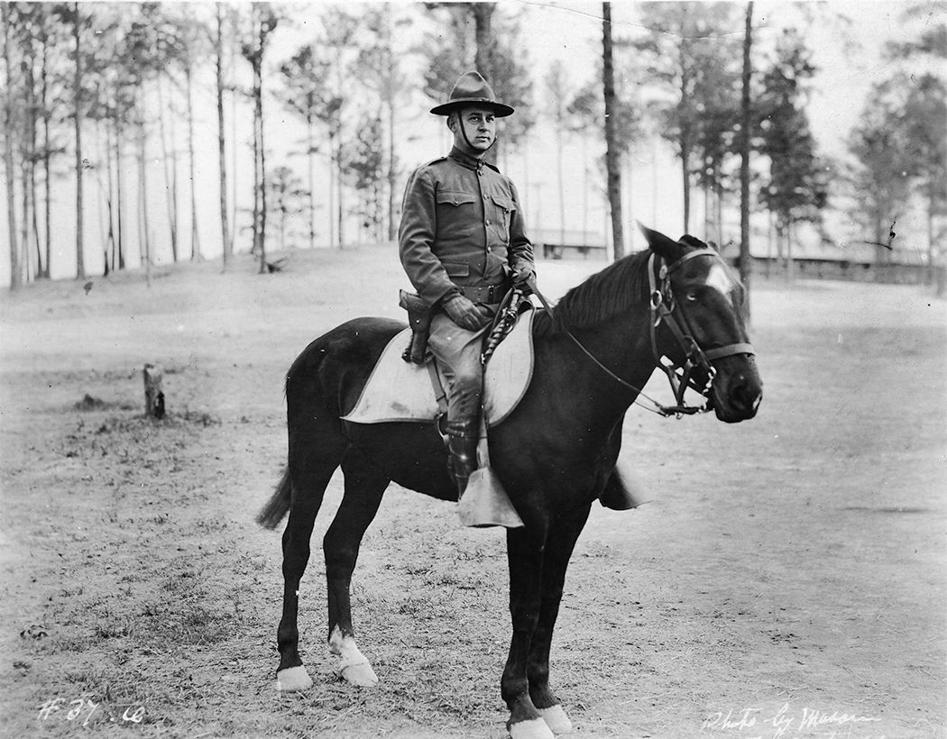 Print, photographic. B/W silver gelatin print, 8.5" x 10.75"; shows Lt. Harry Berwager, in uniform, mounted on a horse. Taken at Camp McClellan, Alabama, 1917. Written on original negative is "Photo by Mason." Written on back is "1st Lt. Harry Berwager Co. H at Camp McClellan, Ala 1917."Acquisition
