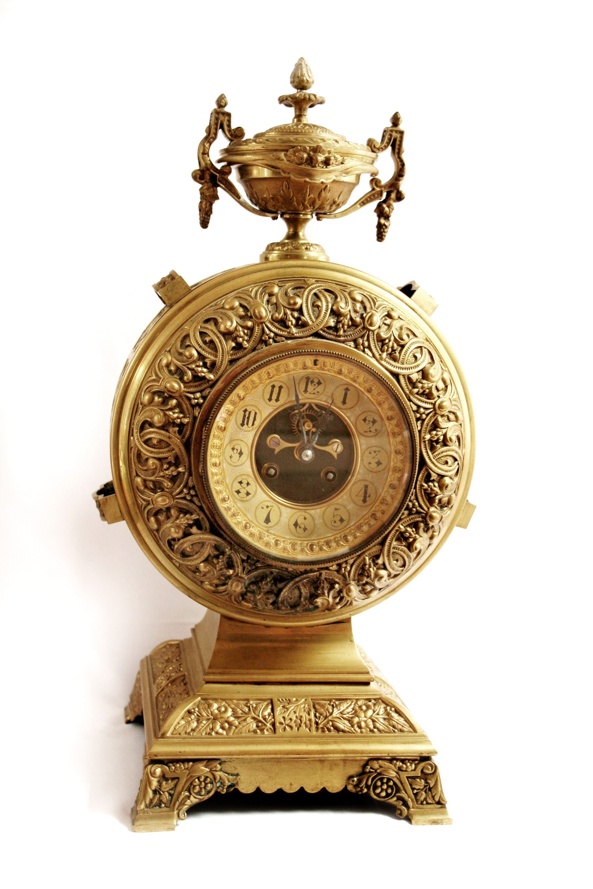 Clock. A: Mantel clock, has a brass casing, 19" x 10" x 8.125", with carved inlay. It is topped by a key compartment in the shape of an urn. The clock face is covered by a glass crystal. 1870-1910. B: removable lid for urn at top of clock. C: key.Acquisition