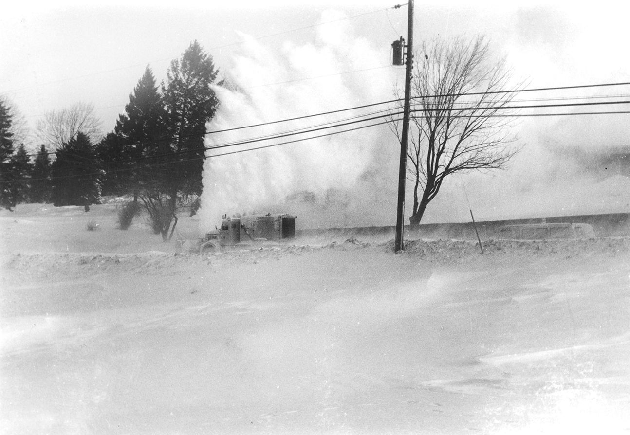 Print, photographic. B/W silver gelatin print on fiber based paper, 5"h x 7"w. Taken 31 January 1966 during the blizzard which hit the East coast of the U.S. Print made 2000 by Bob Porterfield. Original photographer is the donor, Lloyd Thomas. Taken from across an open field, shows a large snowplow clearing a street; snow thrown by the plow is blowing higher than adjacent trees.Acquisition