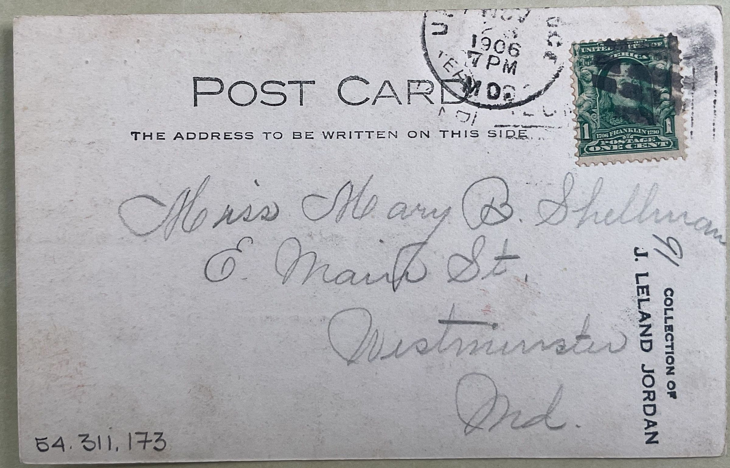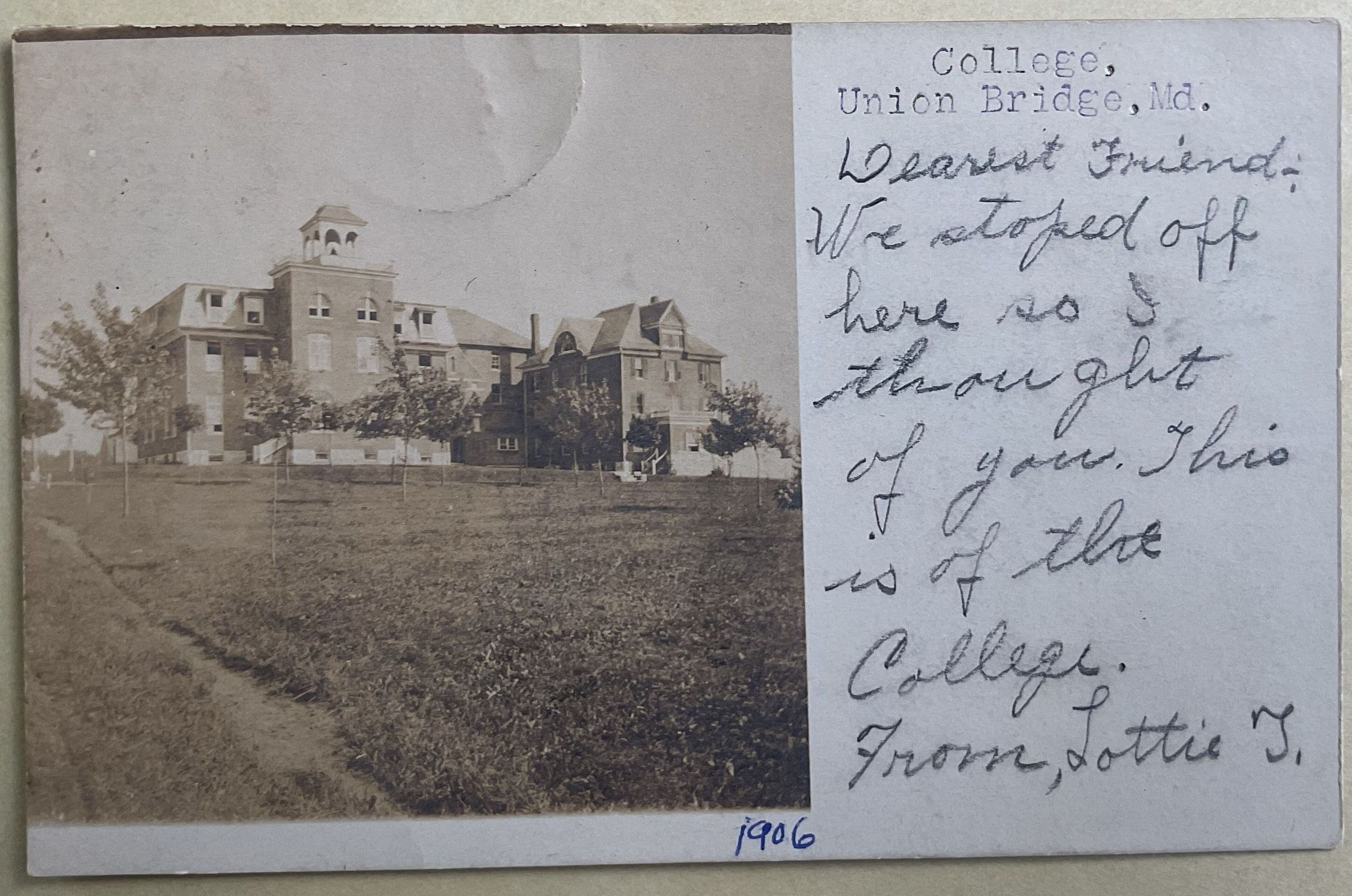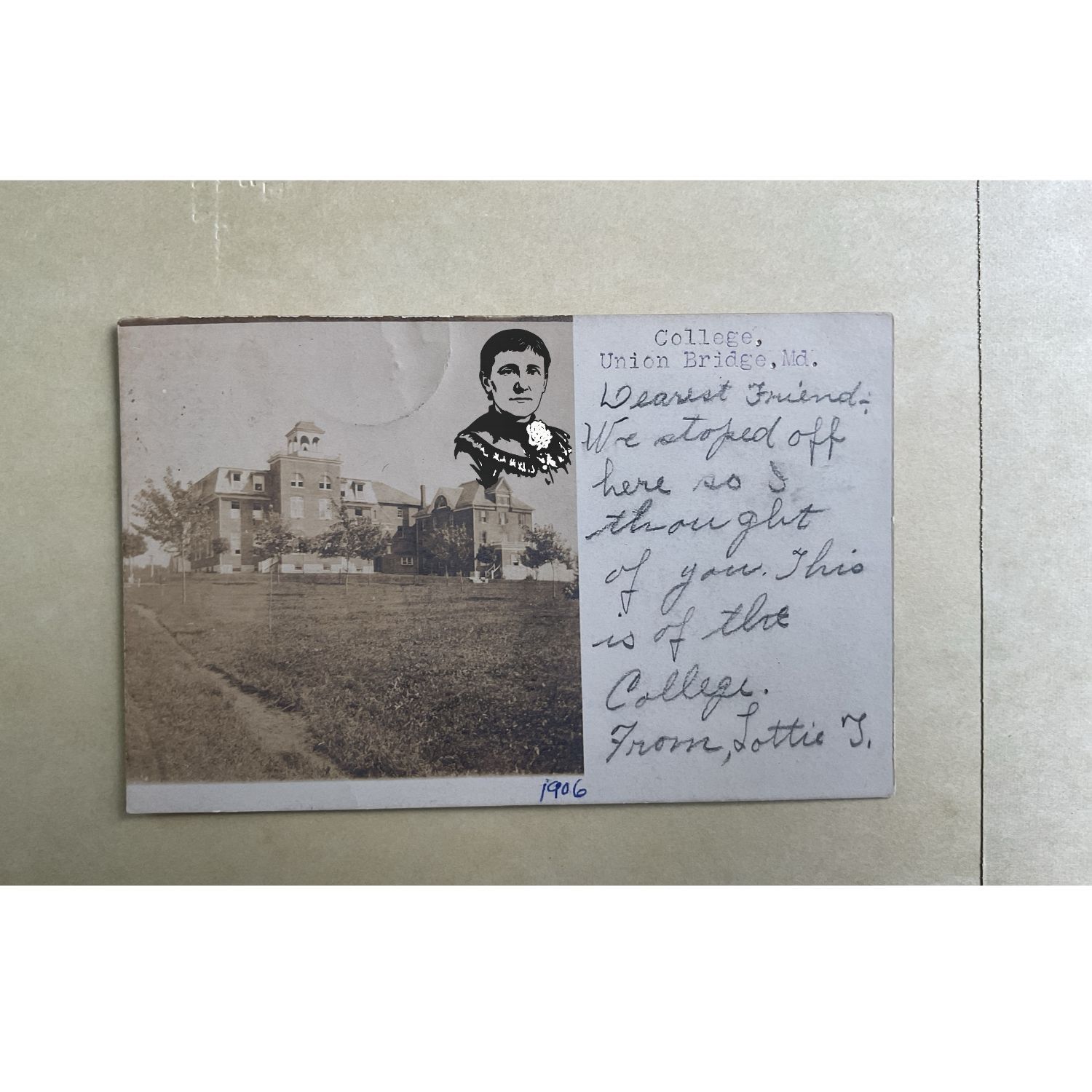 Postcard. B/W photo of Blue Ridge College, Union Bridge. Label on card reads "College, Union Bridge, Md." Handwritten message reads: Dearest friend we stopped off here so I thought of you. This is of that college. From, Lottie J. Addressed to Mary Shellman; postmarked 1906Context