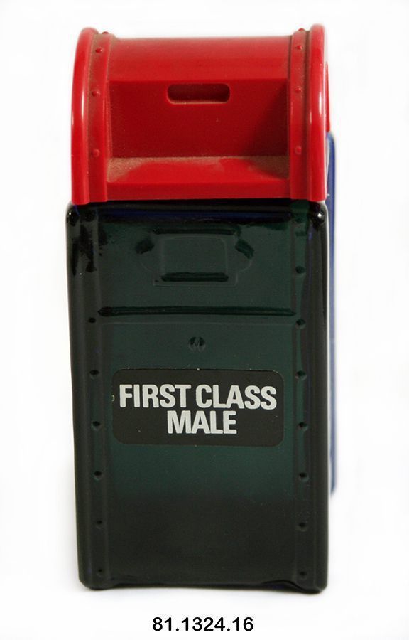 Bottle, toilet. 4.25"h x 2"w x 2"d. Mailbox. Square blue glass container, rounded red plastic cap. Full bottle of cologne. Front reads: "FIRST CLASS MALE (sic)." Bottom: "AVON FIRST CLASS MALE BRAVO AFTER SHAVE 4 FL. OZ. AVON PRODUCTS INC. NEW YORK, N.Y. 10020."Acquisition