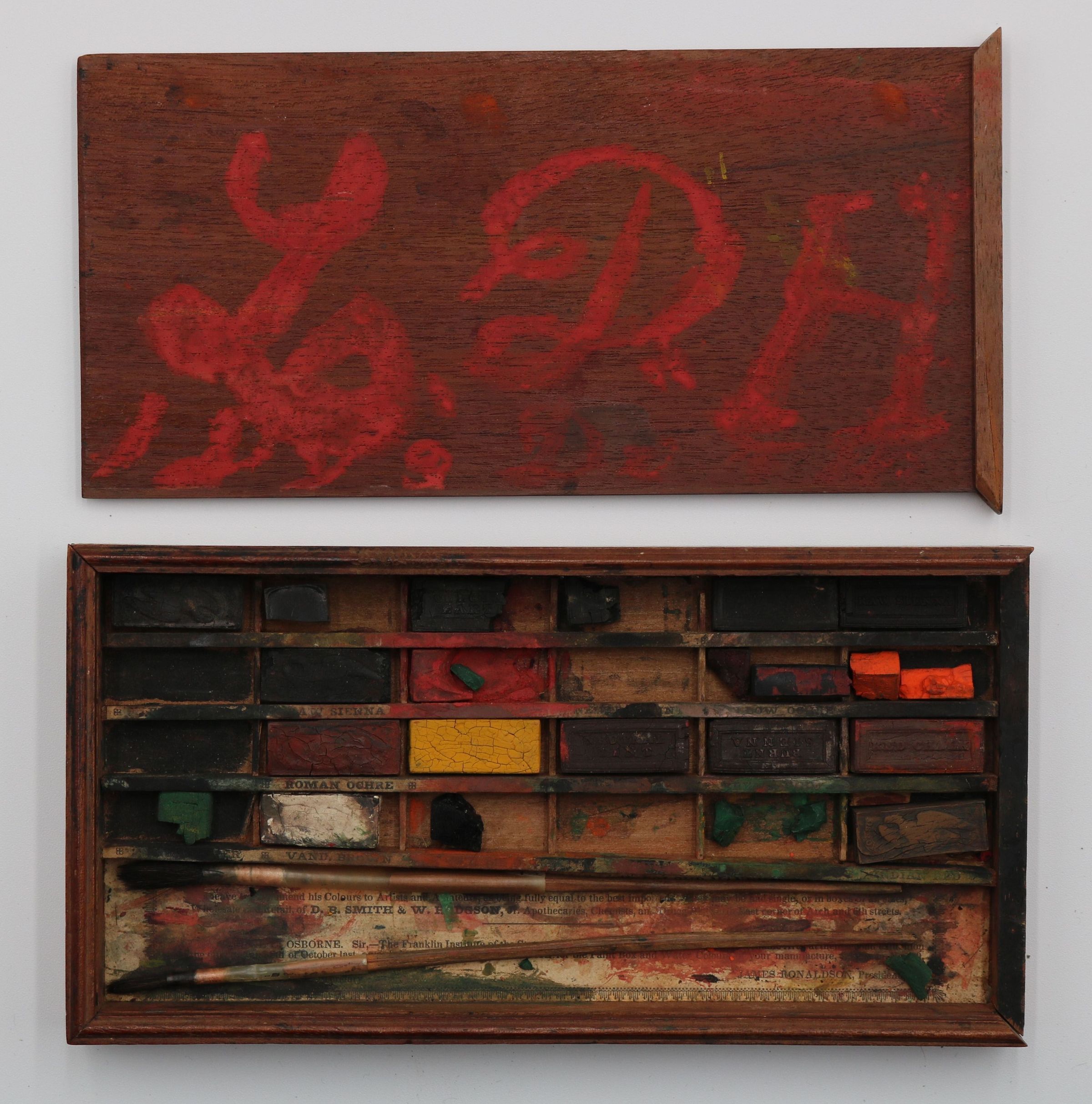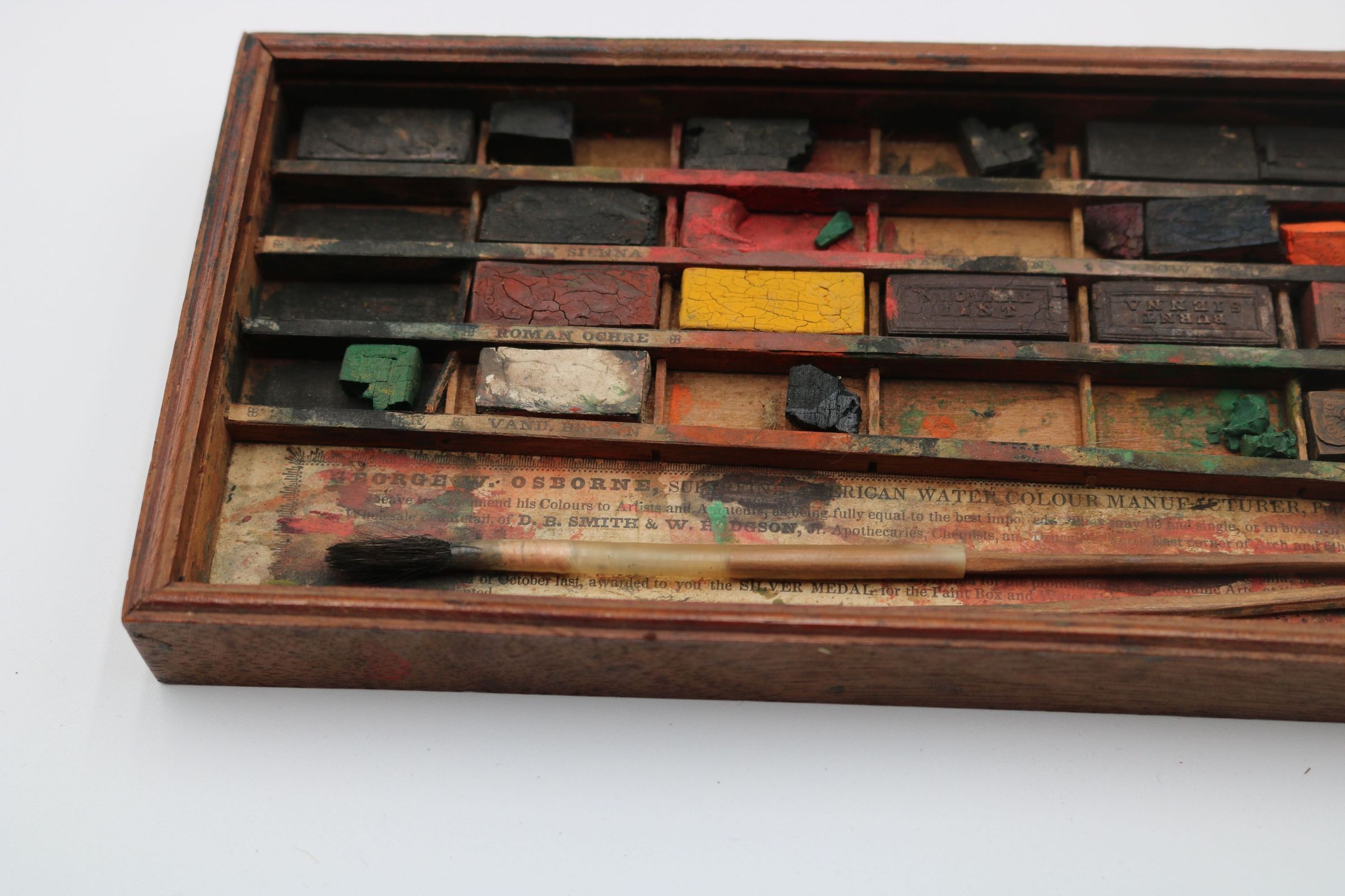 0.875"h x 7.75"w x 4"d. Shallow wood box with sliding lid. Sectioned interior with rectangular blocks of used watercolor pigment, two paintbrushes. Label inside is partially illegible, titled "GEORGE W. OSBORNE, SUPERFINE AMERICAN WATER COLOUR MANUFACTURER, PHILADELPHIA." Painted in red inside lid "L. D. H." Illegible writing on bottom of box.