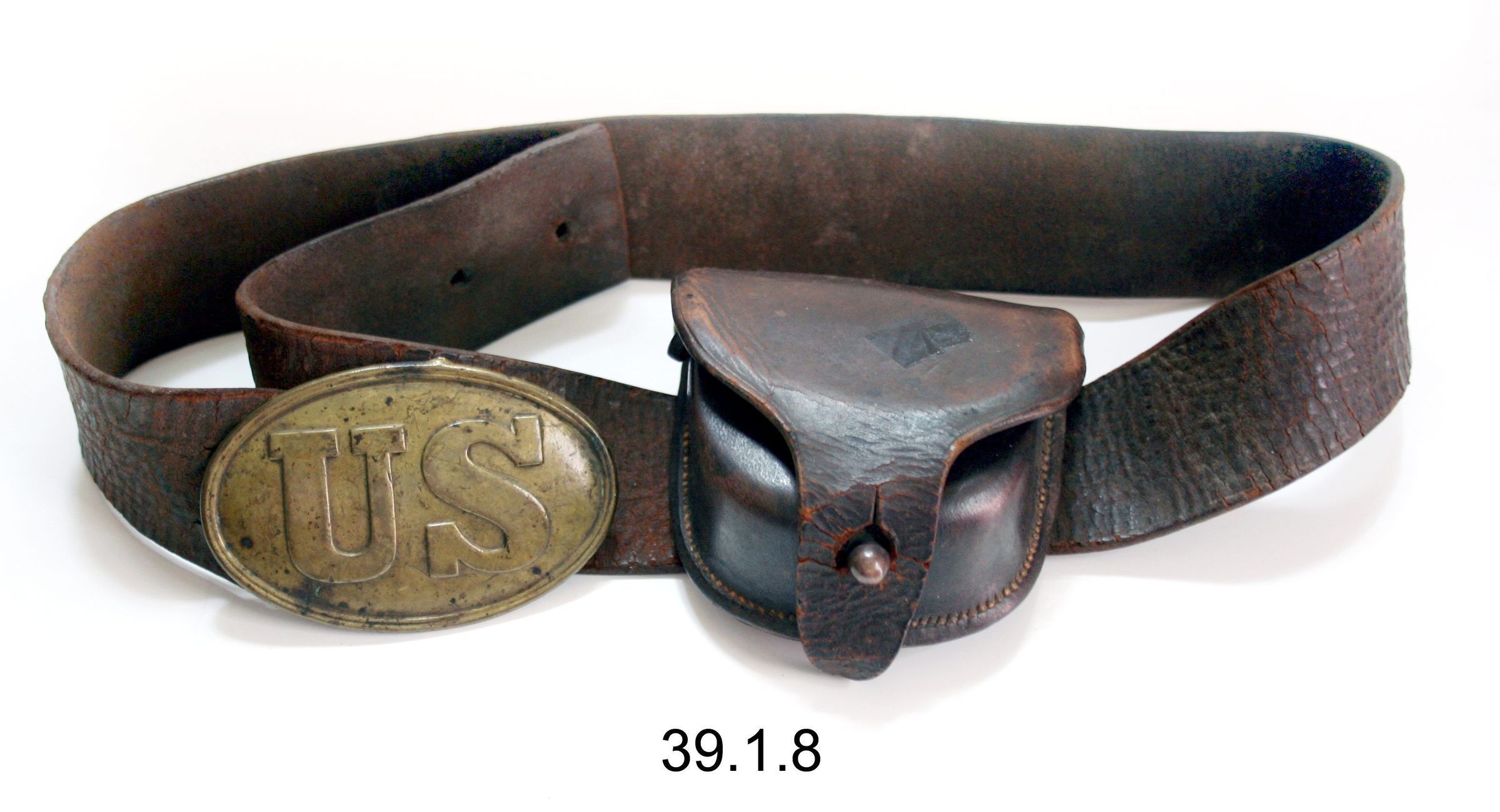 Box, percussion cap. Leather pouch with two flaps, outer one with slit to fit over brass peg. Two belt loops on back. Attached to brown leather belt (1.75"h x 34.5"w) with oval brass buckle marked "US". 3.5"h x 3.5"w x 1.5"d.Acquisition