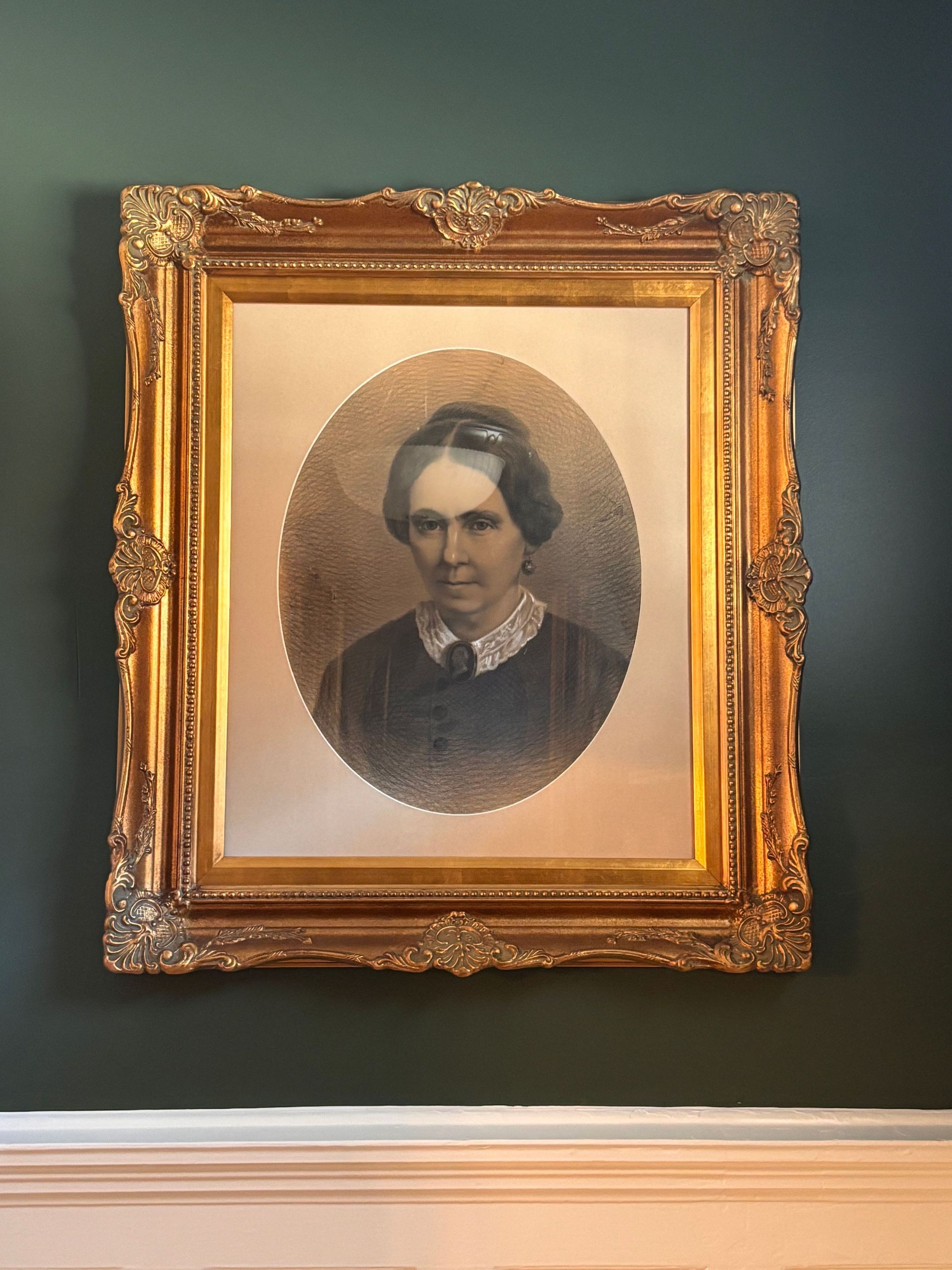 Drawing, charcoal and pencil. Charcoal portrait of an older woman looking to the left with black hair in a bun and parted in the center. Figure is wearing a dark buttoned dress with a high lace collar and large brooch, with one dangling earring visible to the viewer. Portrait has a white oval mat and gilded gold frame with scroll filigree detailing on corners.Context