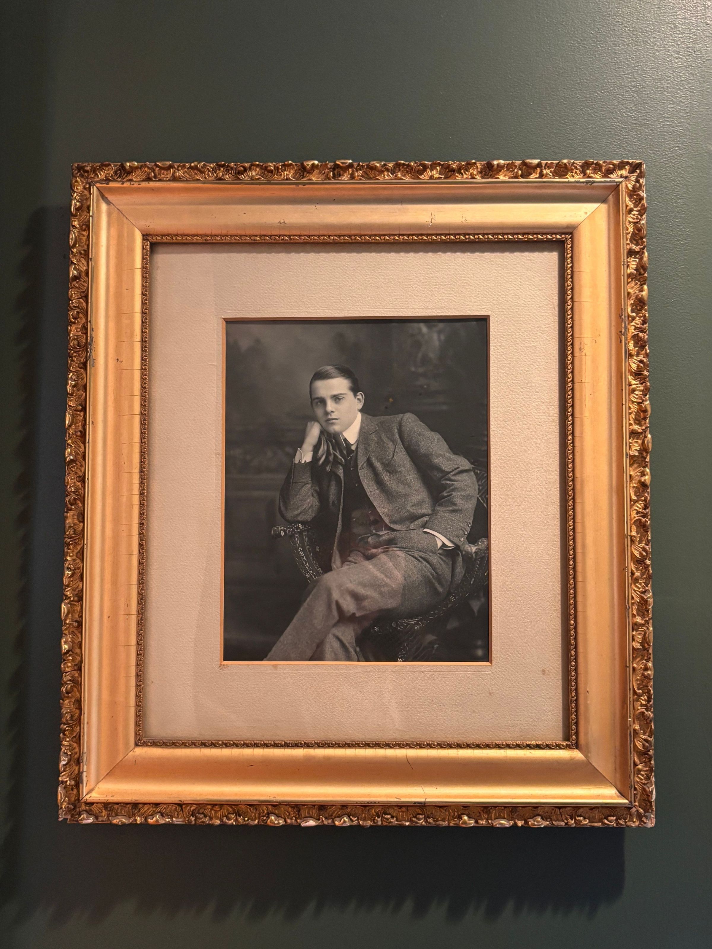 print, photographic. Black/white portrait of young man sitting, leaning elbow on arm of chair, resting chin on hand holding gloves, other hand in pocket. Handwritten label on back: "Frank Ridgely Snowden Brown Son of Gov. and Mrs. Brown. Mrs. Frank B. Beasman - donor." Sticker on back: "McCADDIN AND McELWEE, 30 WEST BALTIMORE ST., BALTIMORE, MARYLAND." Rectangular wood and gesso frame, chunky decoration, painted gold. 24.5"h x 21.5"w x 1"d.Acquisition
